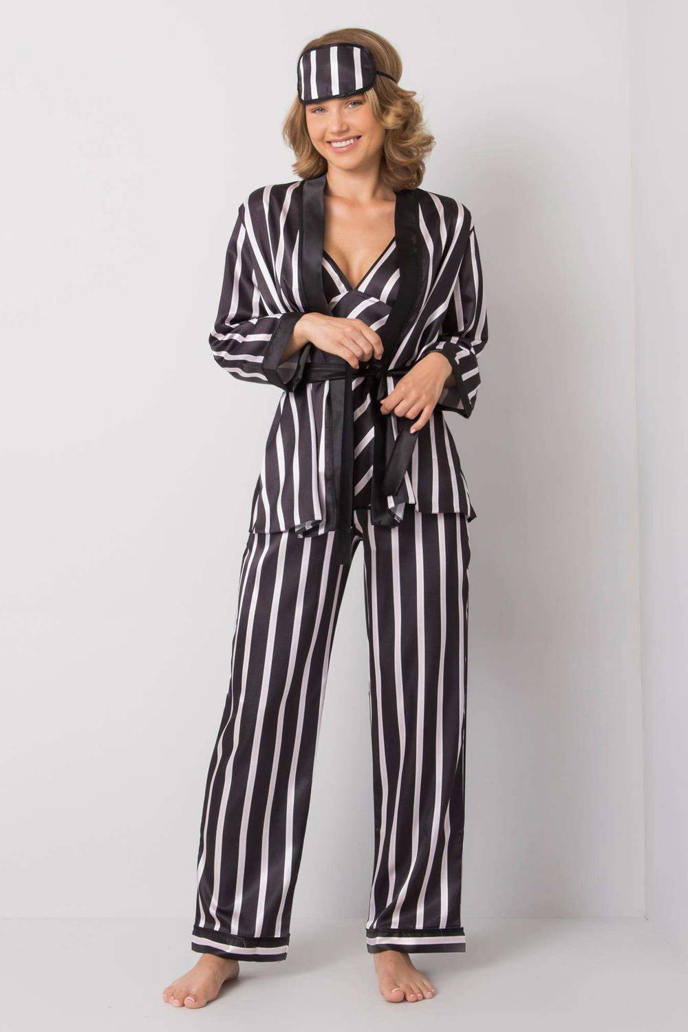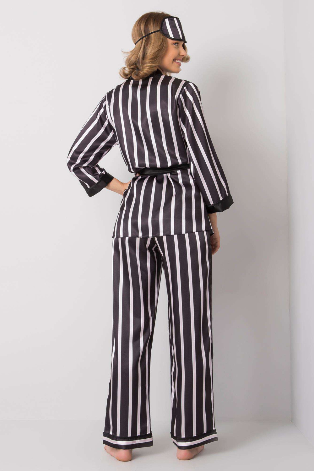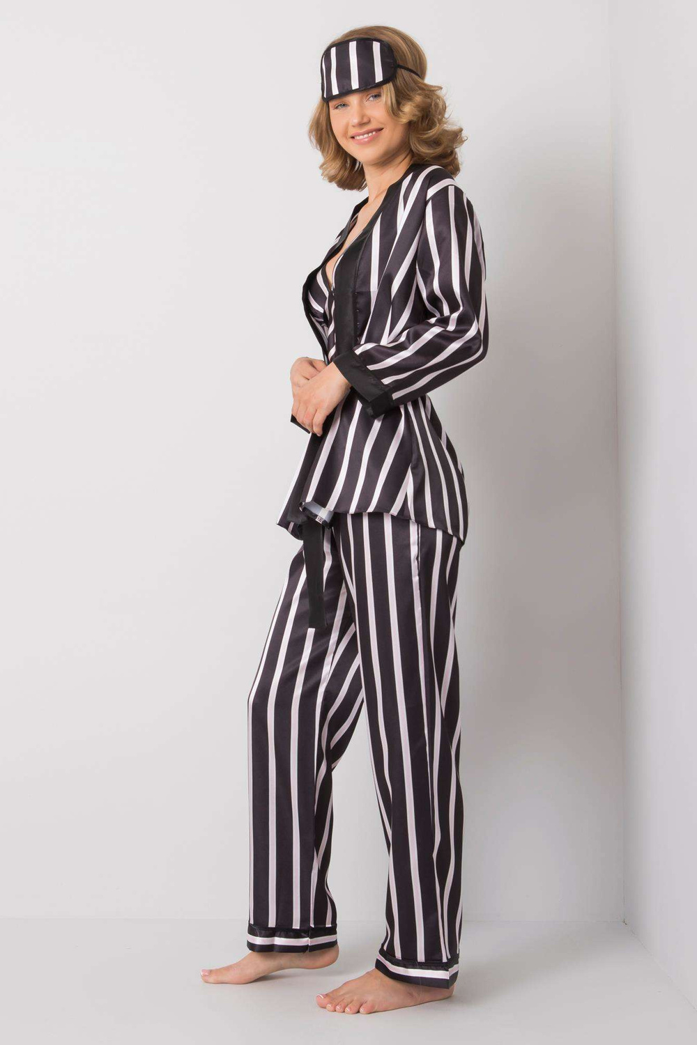 Juodų juostų lovos komplektas. į komplektą įeina: kelnės, viršus, lovatiesė, raištis akims Medžiaga: 100% poliesteris skalbimo būdas: skalbimas skalbimo mašinoje 30°C. Modelis dėvi S dydį. Modelio išmatavimai: aukštis 170 cm, krūtinė 89 cm, juosmuo 59 cm, klubai 85,5 cm.< /div>