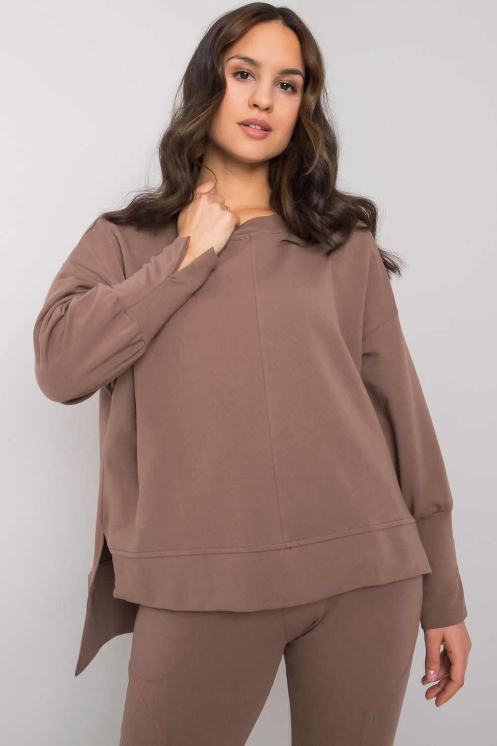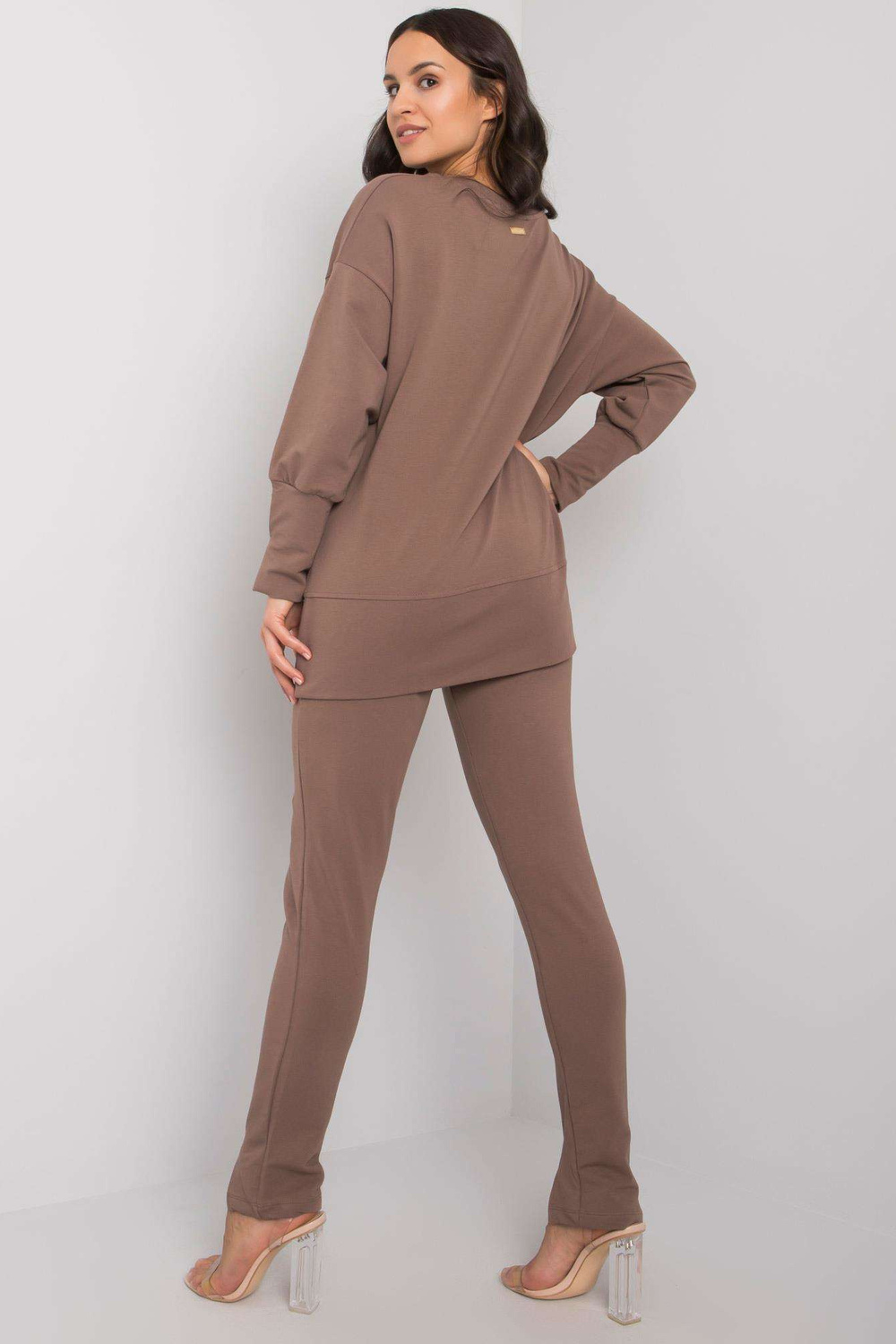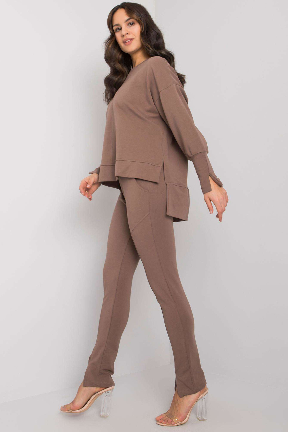 Komplekto matmenys S/M dydžiu matuojant plokščią: megztinio plotis po pažastimis - 61 cm, rankovės ilgis - 56 cm, megztinio ilgis - 67 cm, plotis kelnės ties juosmeniu - 37 cm, kelnių ilgis - 94 cm