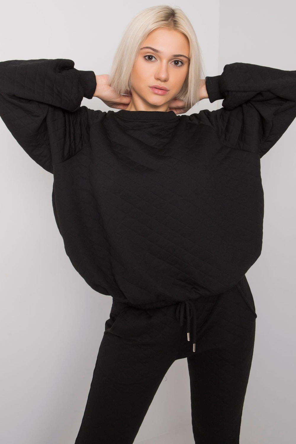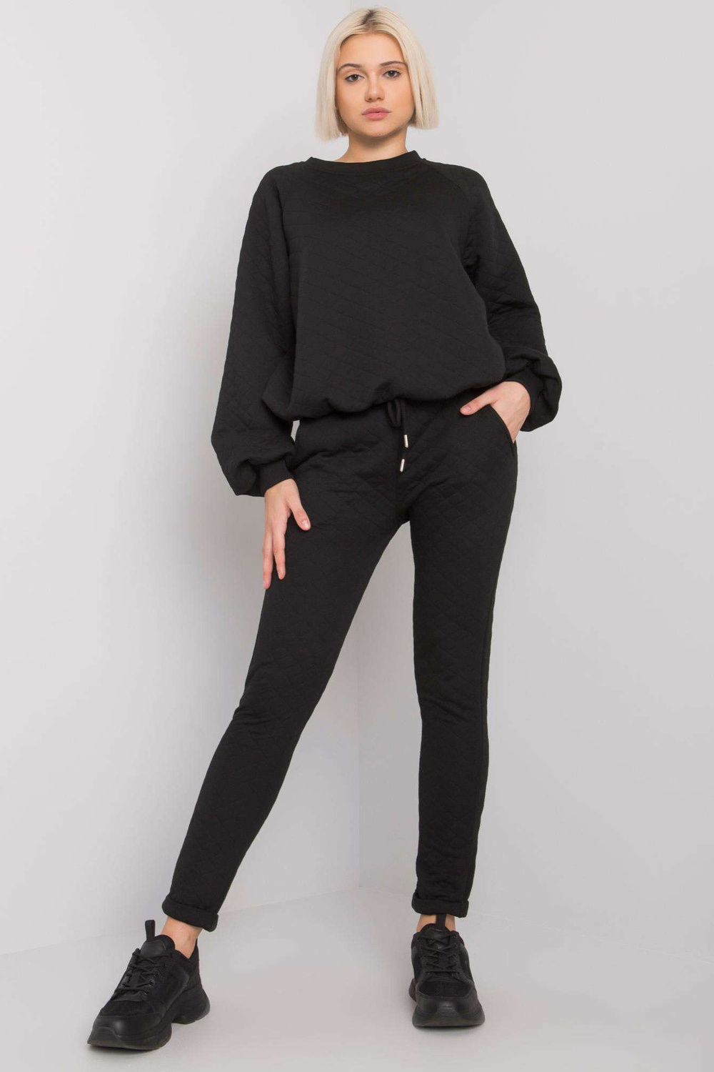 Juodas dviejų dalių dygsniuotas rinkinys Palermo. Į šį rinkinį įeina: megztinis, kelnių medžiagasudėtis: 90% medvilnė, 10% elastanas skalbimo būdas: skalbimas skalbimo mašinoje 30°C Gaminio kodas: RV-KMPL-7448.28 dominuojantis raštas: be rašto Stilius: kasdienis, miesto stiliaus proga: kasdienis