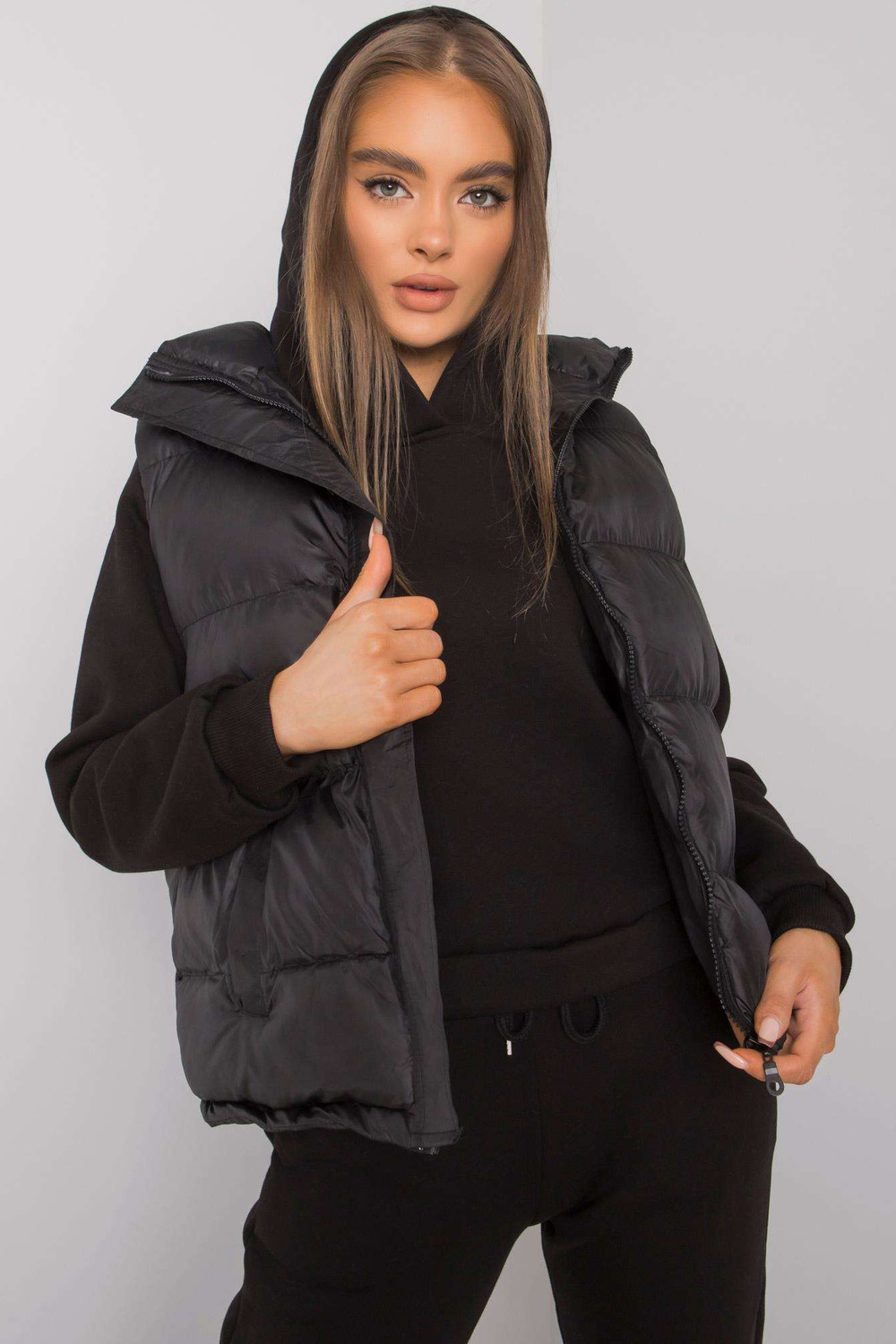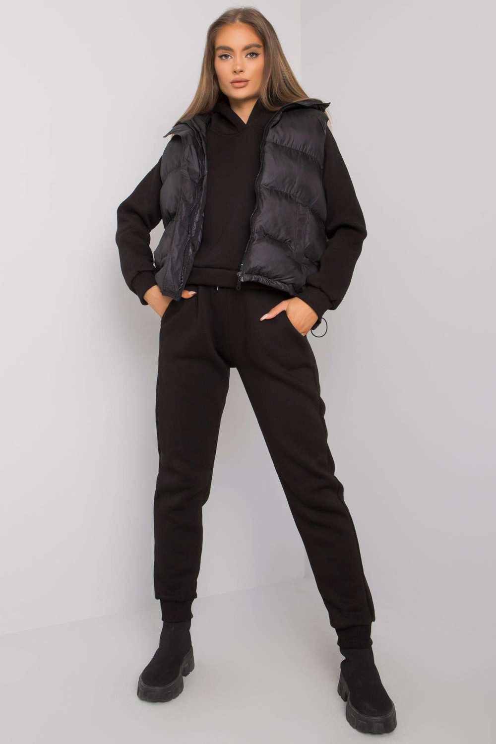 Juodos komplektacijos su Aysel liemene. komplekte: megztinis, sportinės kelnės, pūkinės liemenės medžiagasudėtis: sportiniai kostiumai - 70% medvilnė, 30% poliesteris; Liemenė - 100% poliesterio skalbimo būdas: skalbimas mašinoje 30°C. Modelis dėvi S/M dydį. Modelio matmenys: aukštis 174 cm,