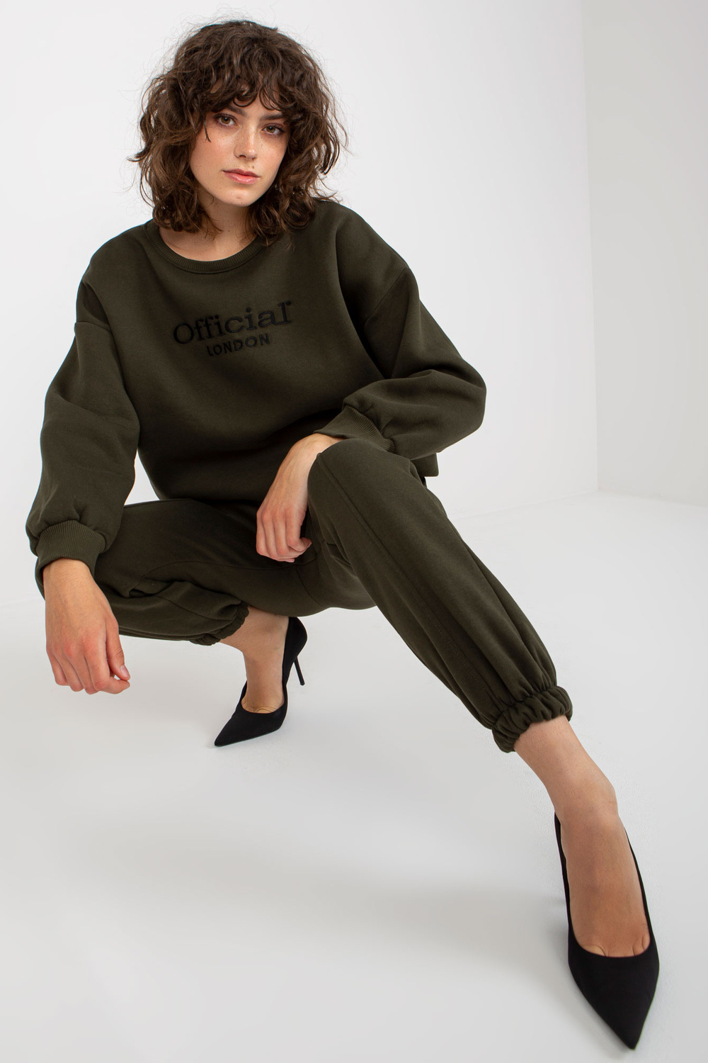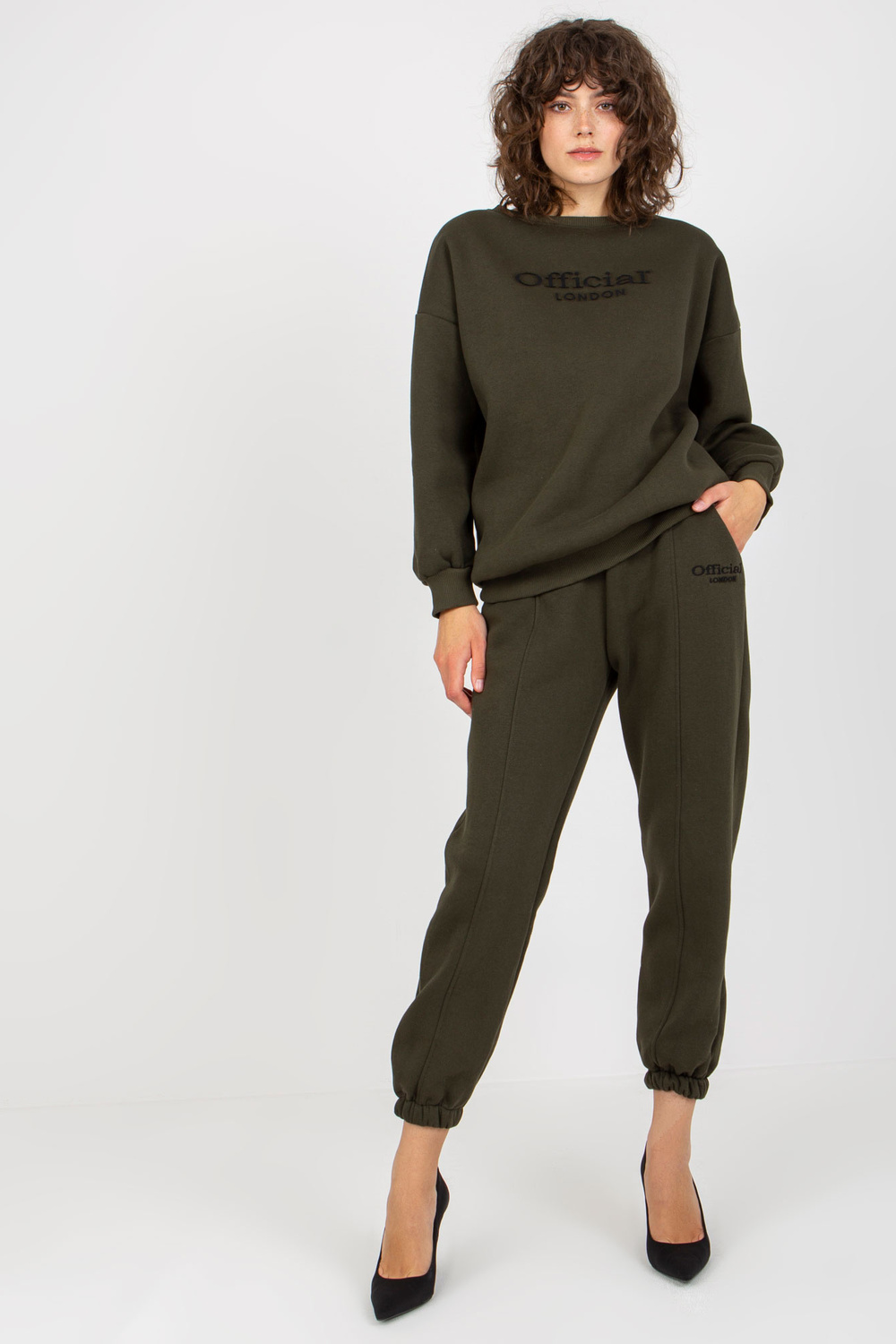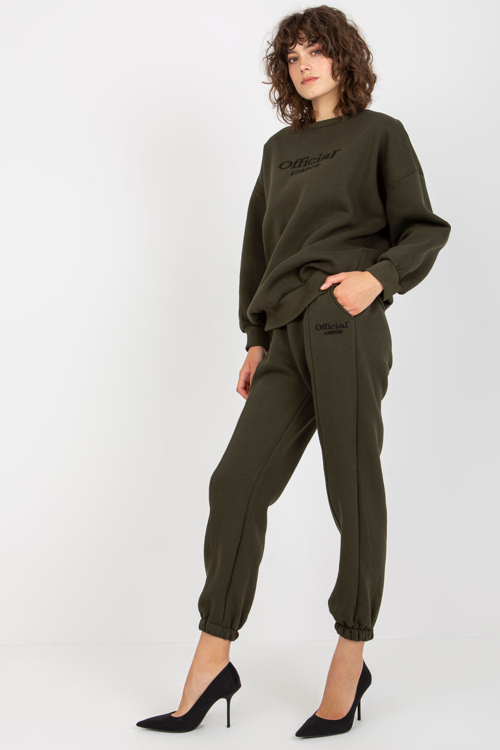 Khaki spalvos dviejų dalių sportinio kostiumo komplektas su lopais