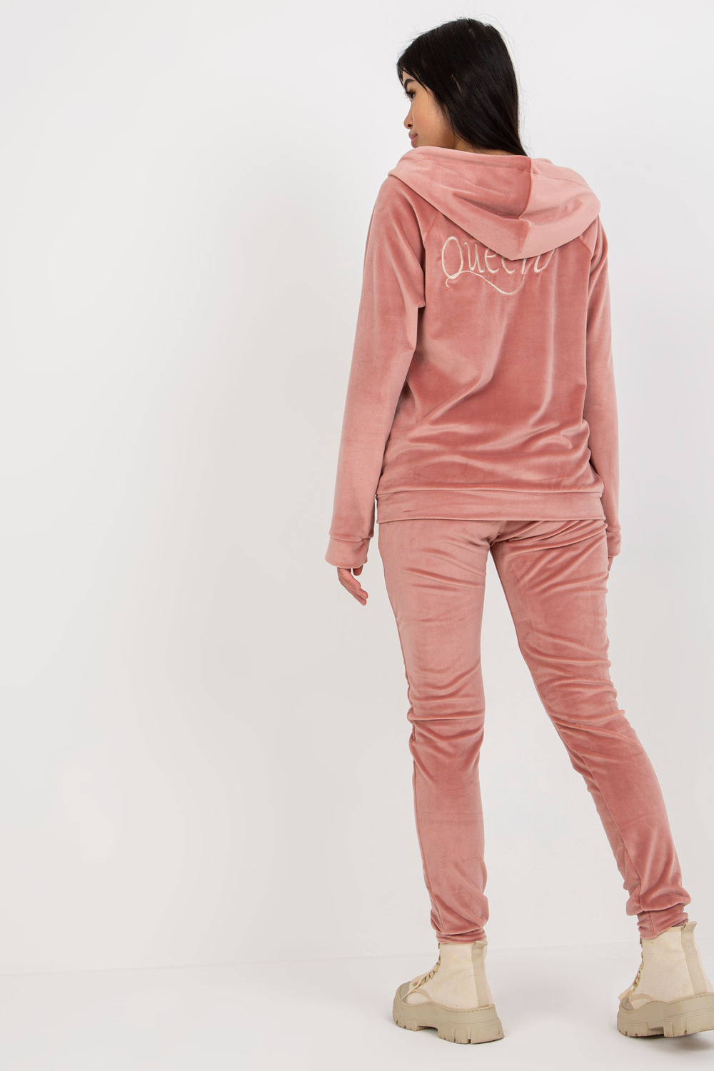 Nešvarus rožinis dviejų dalių veliūrinis rinkinys su kelnėmis.