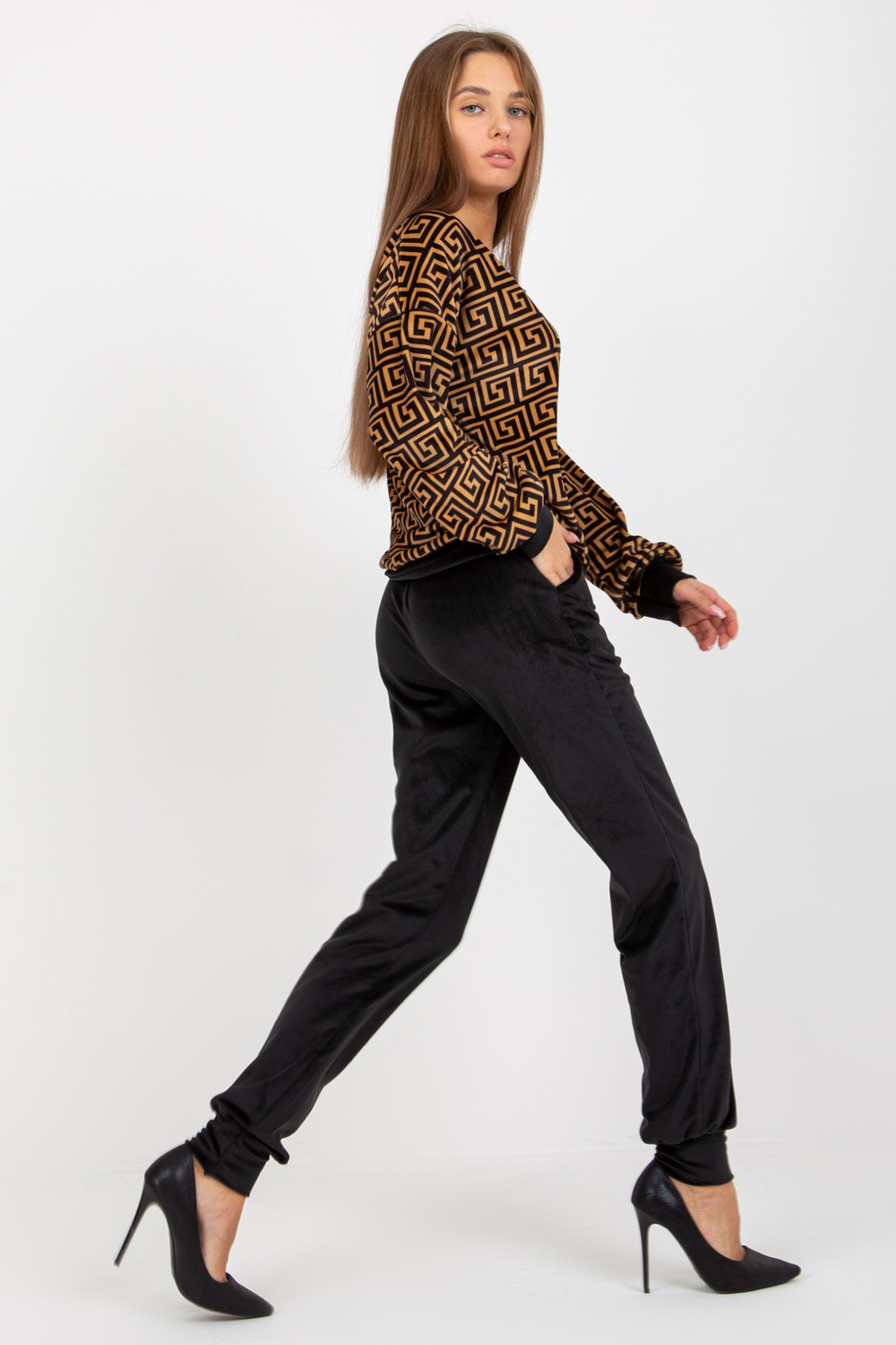S/M dydžio rinkinio matmenys išmatuoti plokščiai: megztinio plotis po pažastimis - 57 cm, rankovės ilgis - 60 cm, megztinio ilgis - 60 cm, kelnių plotis ties juosmeniu - 34 cm, juosmens aukštis - 31 cm, kelnių ilgis - 97 cm .<