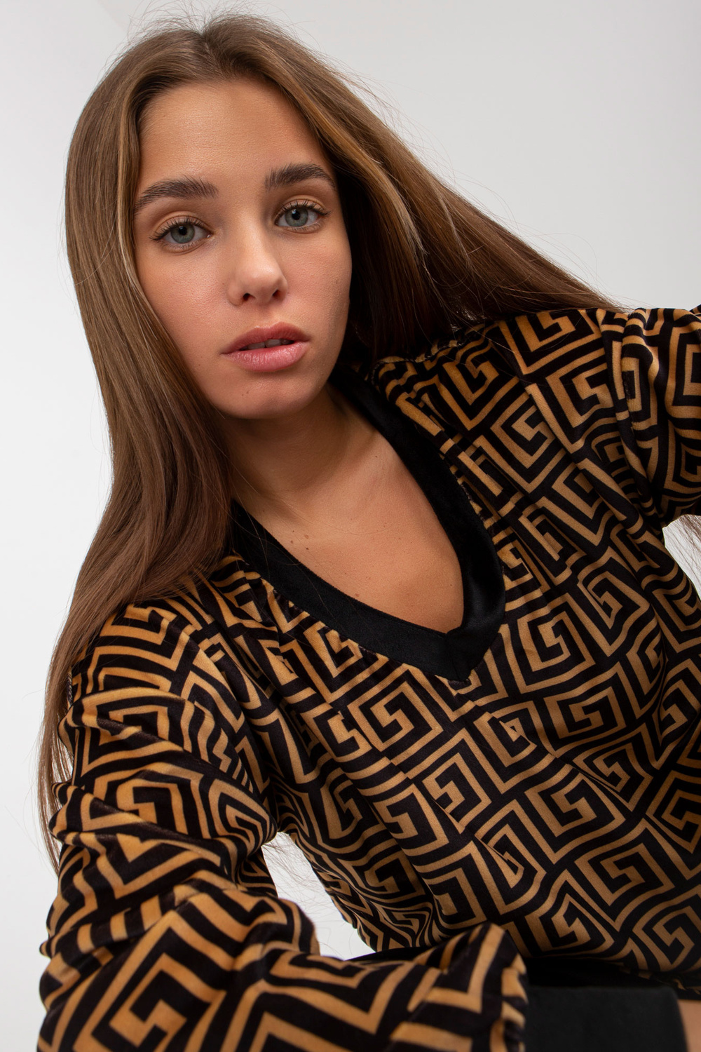 Modelis dėvi S/M dydį. Modelio išmatavimai: ūgis 163 cm, krūtinė 86 cm, juosmuo 56 cm, klubai 88 cm