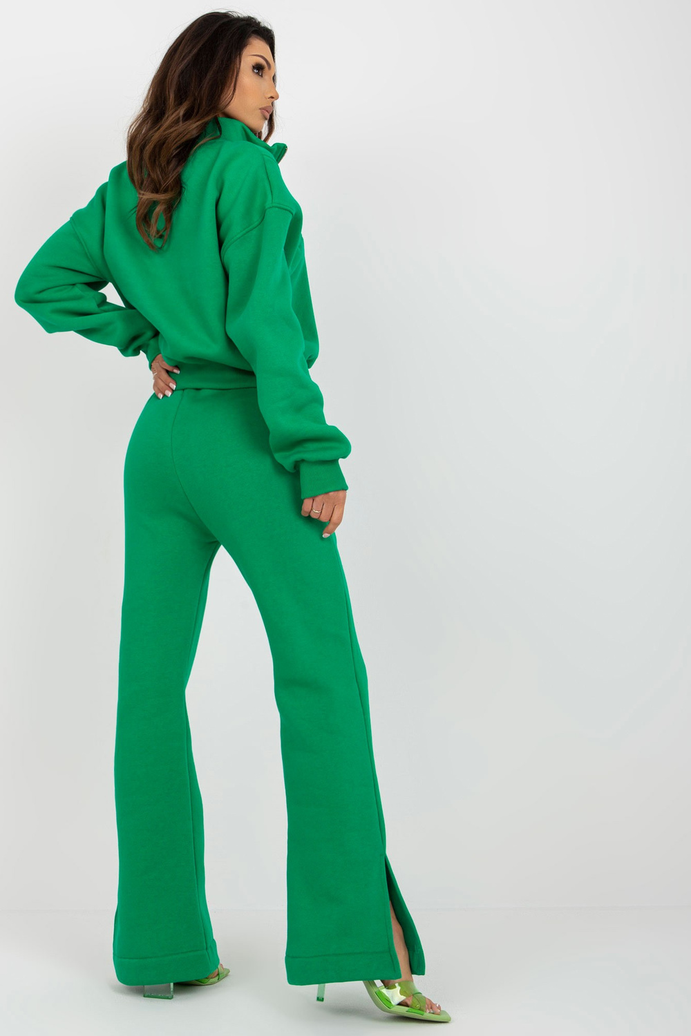 Komplekto matmenys vieno dydžio, matuojamas plokščias: megztinio plotis po apačia rankos - 60 cm, rankovių ilgis - 66 cm, megztinio ilgis - 58 cm, kelnių juosmens plotis - 35 cm, juosmens aukštis - 34 cm, kelnių ilgis - 107 cm.