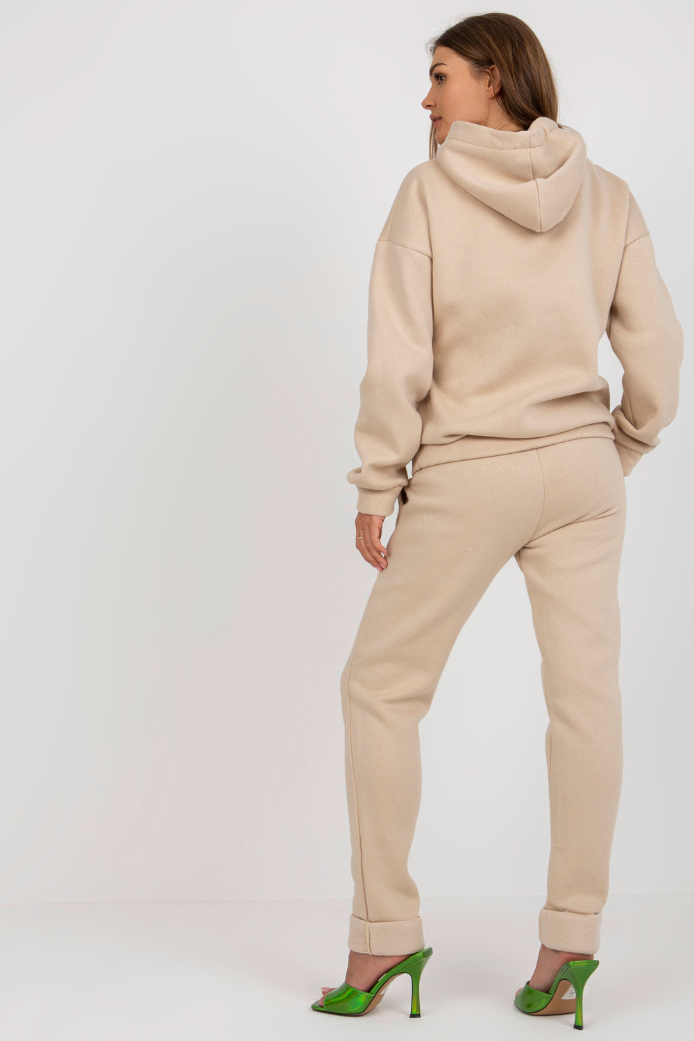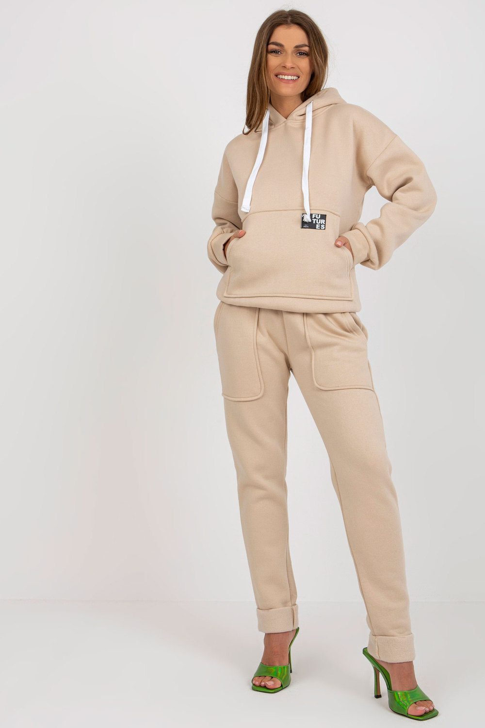 Smėlio spalvos moteriškas sportinio kostiumo komplektas su tiesiomis kelnėmis.