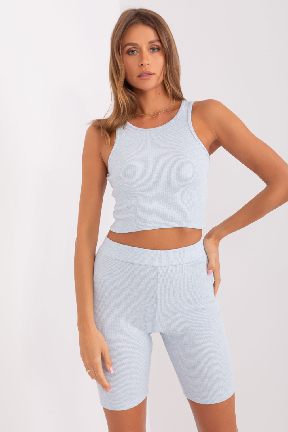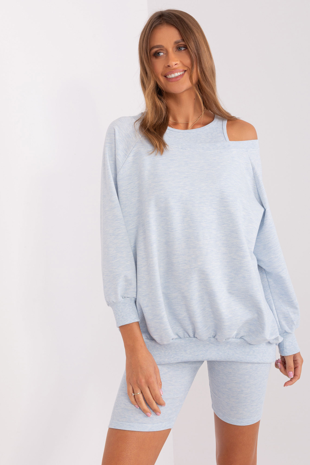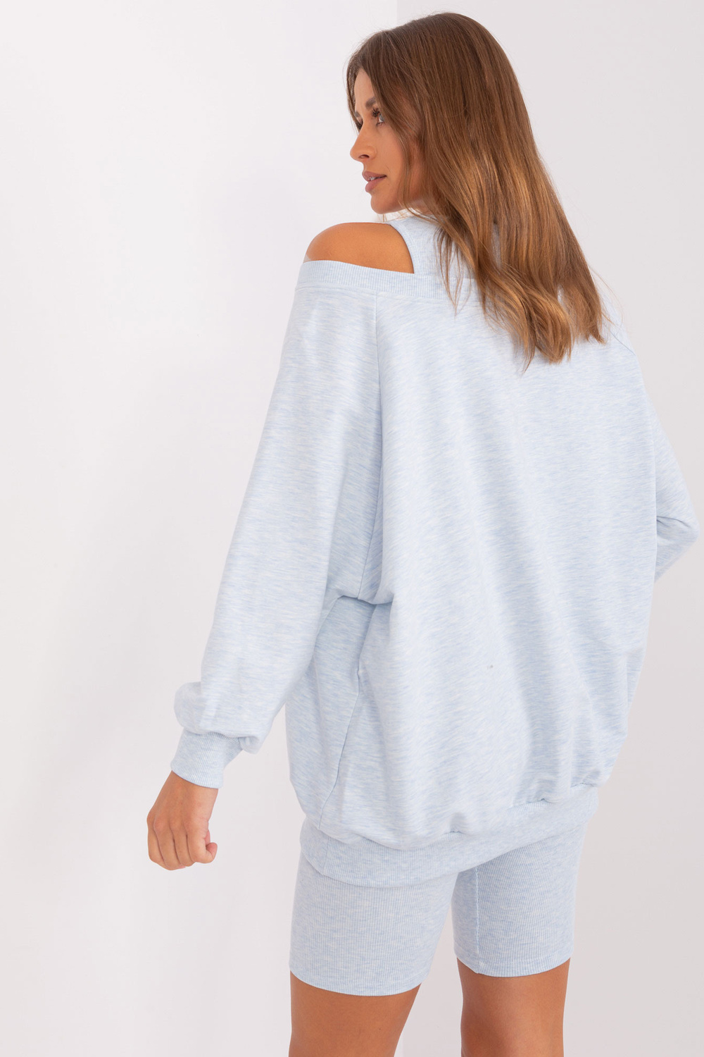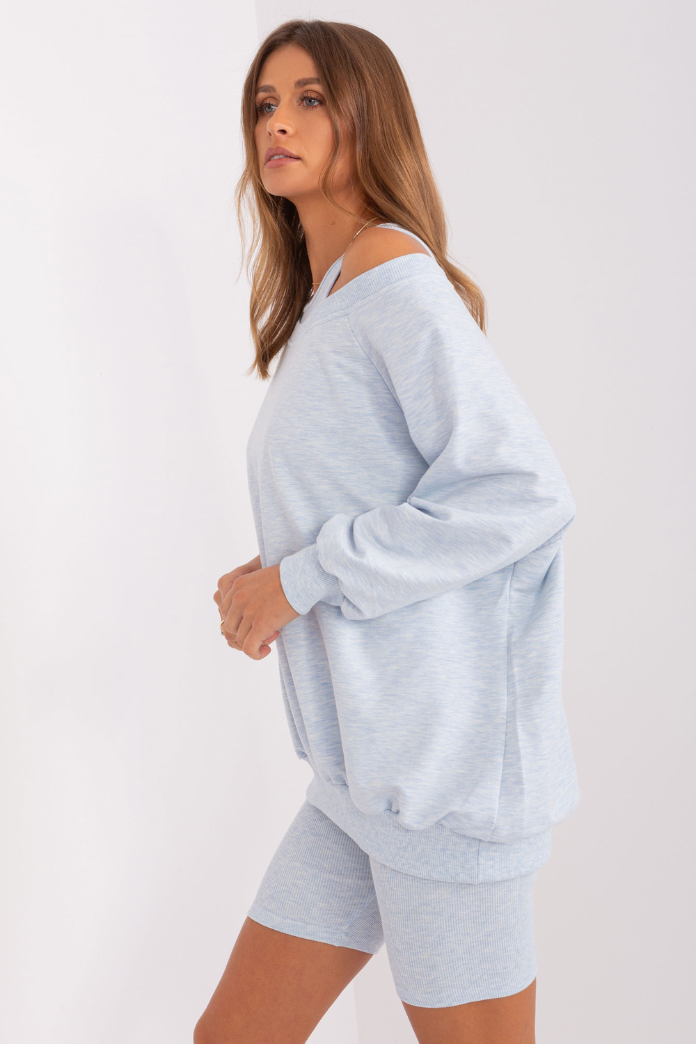 Komplekto matmenys vieno dydžio, matuojamas plokščias: megztinio plotis po apačia rankos - 69 cm, rankovių ilgis - 56 cm, megztinio ilgis - 68 cm, viršaus plotis po pažastimis - 32 cm, viršaus ilgis - 41 cm, juosmens plotis - 30 cm, dviratininko ilgis - 46 cm.