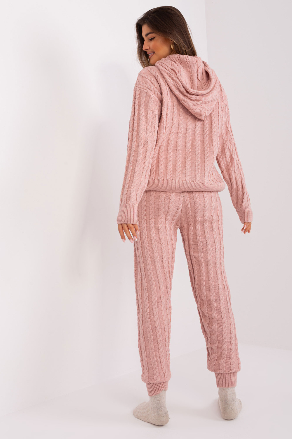Komplekto matmenys vieno dydžio, matuojamas plokščias: megztinio plotis po apačia rankos - 54 cm, rankovių ilgis - 59 cm, megztinio ilgis - 62 cm, juosmens plotis - 30 cm, kelnių ilgis - 111 cm, juosmens aukštis - 36 cm.