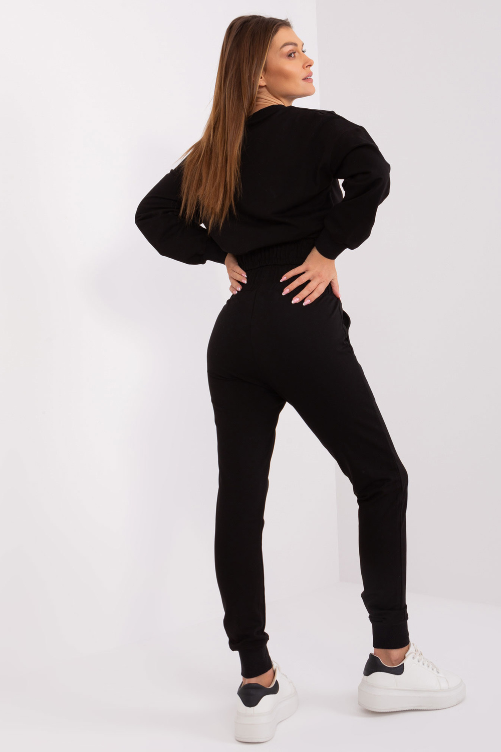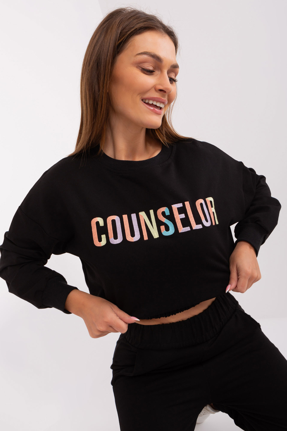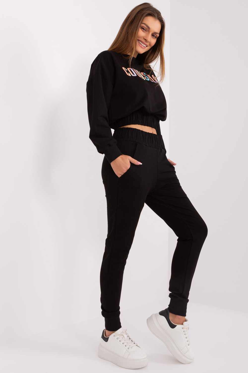 Juodas medvilninis komplektas su megztiniu su spalvingu užrašu .