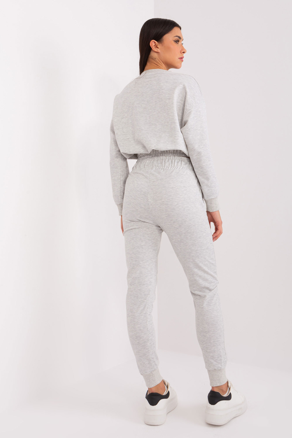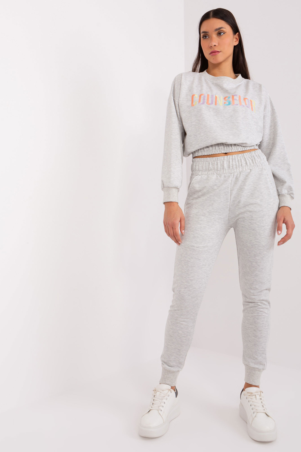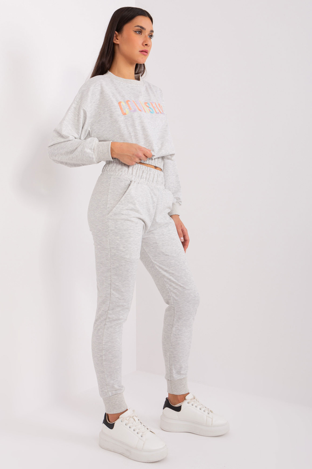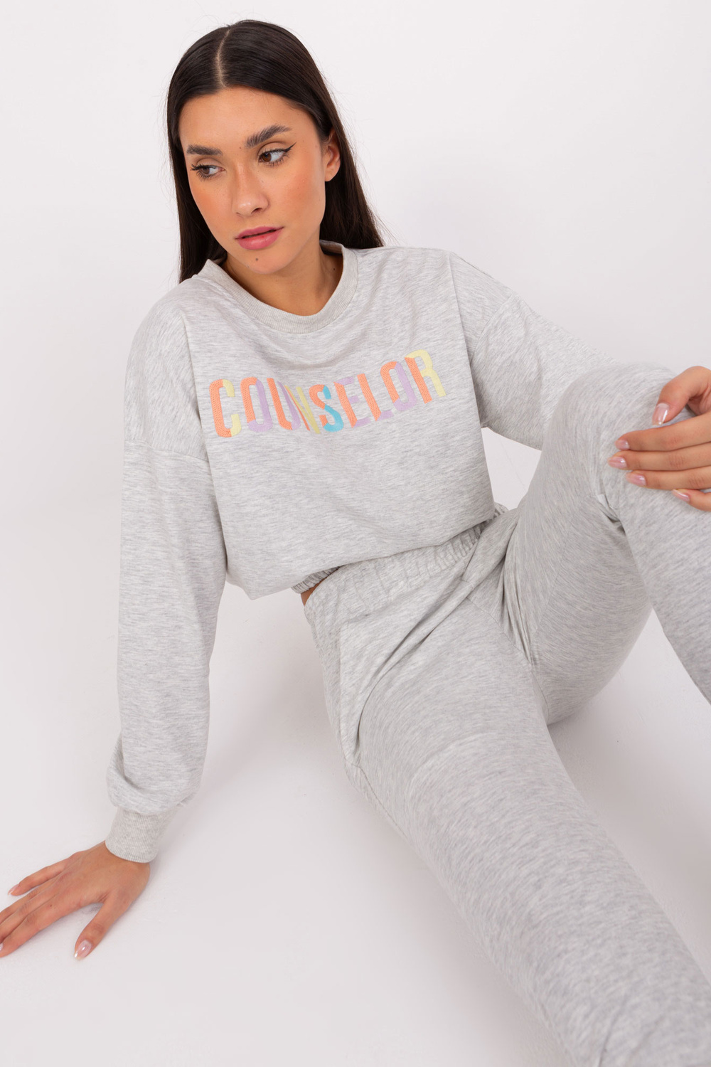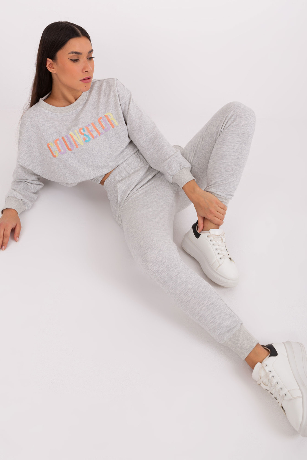 Šviesiai pilkas laisvalaikio komplektas su megztiniu su spalvingu užrašu .