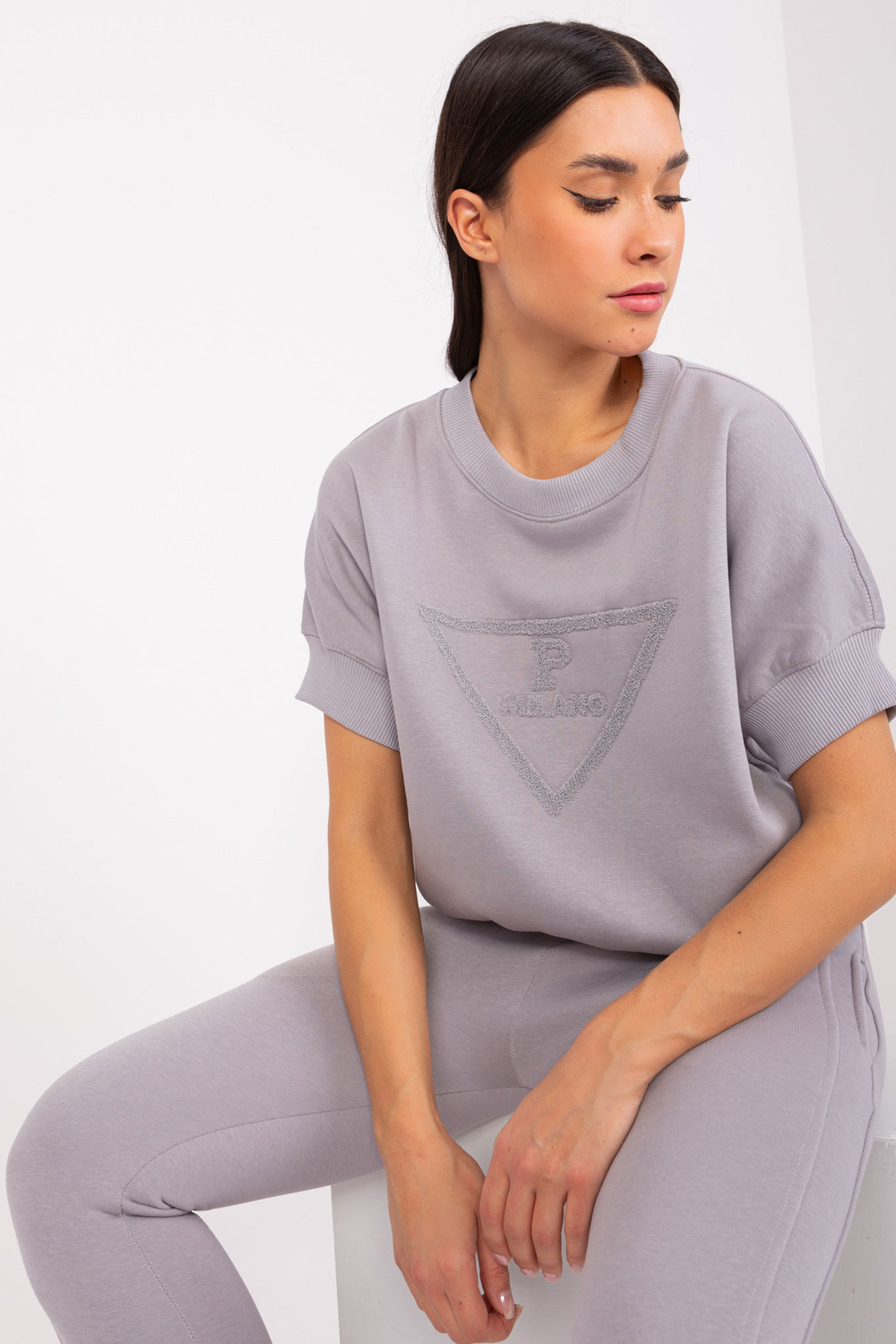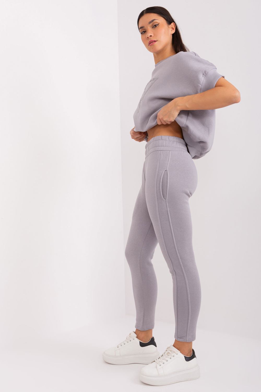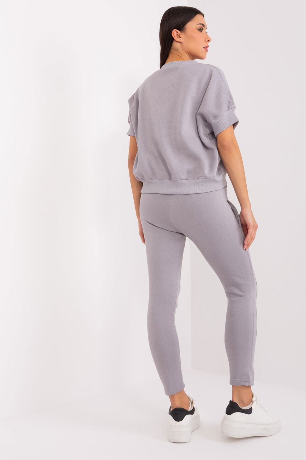 Pilkas dviejų dalių sportinio kostiumo komplektas su pleistru .