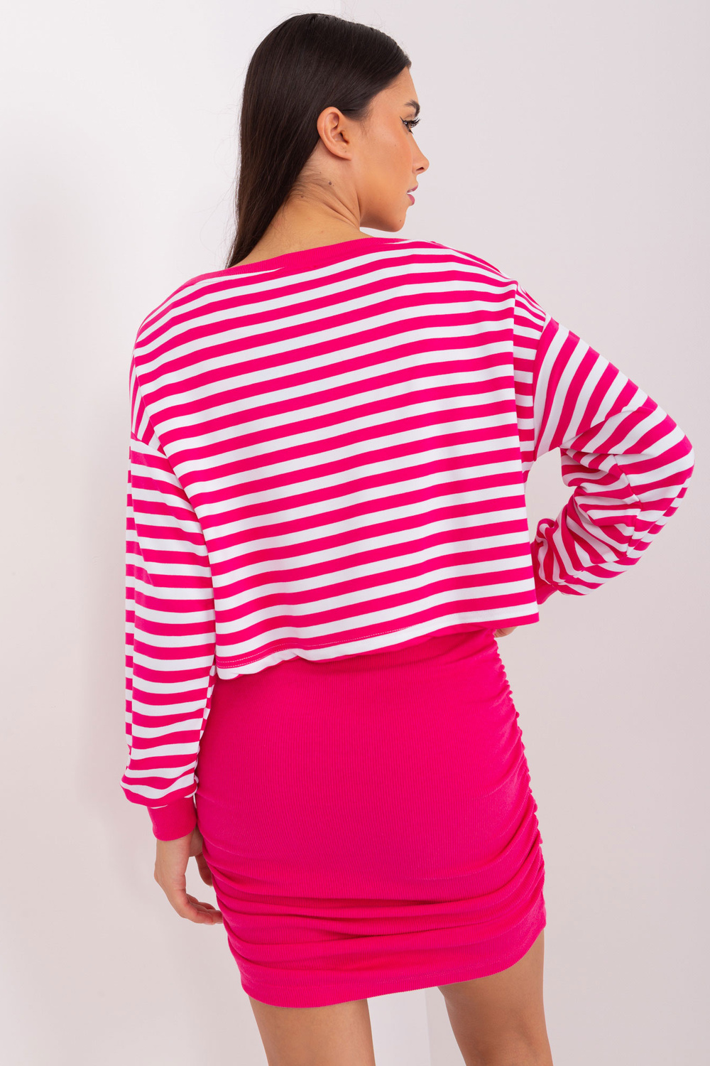 Fuksijos ir baltos spalvos bazinis komplektas su raukta suknele .
