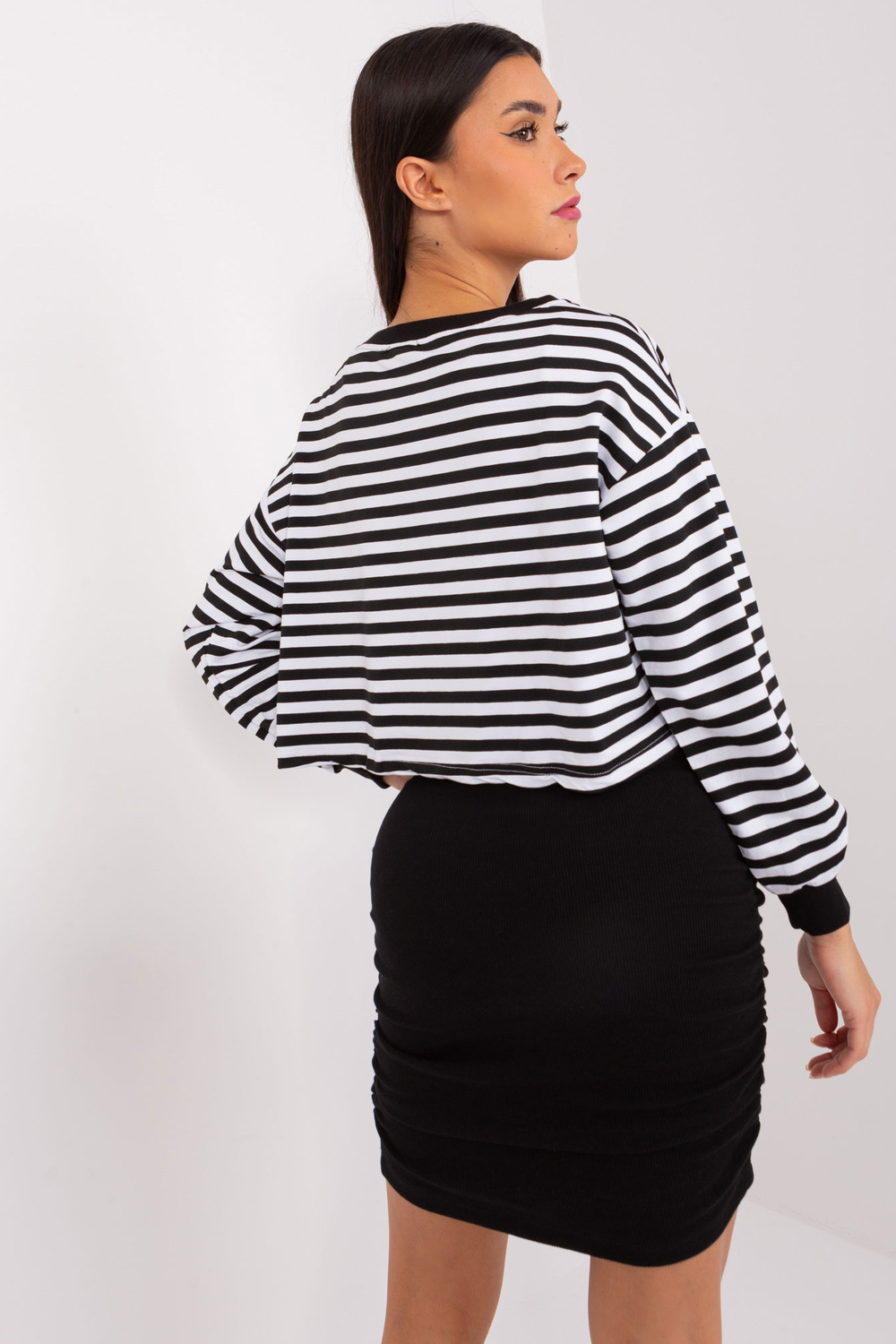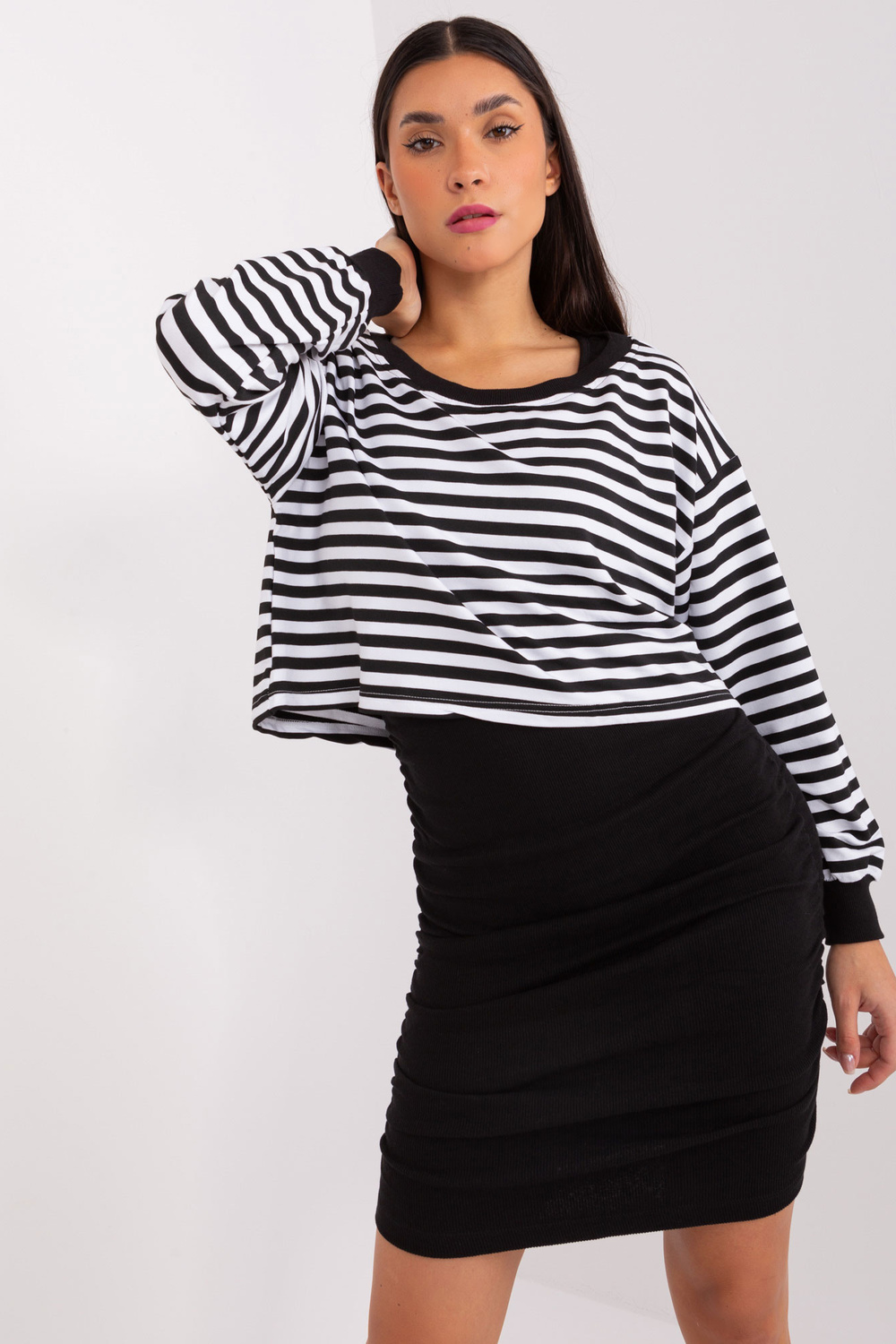 Juodai baltas bazinis komplektas su briaunuota suknele .