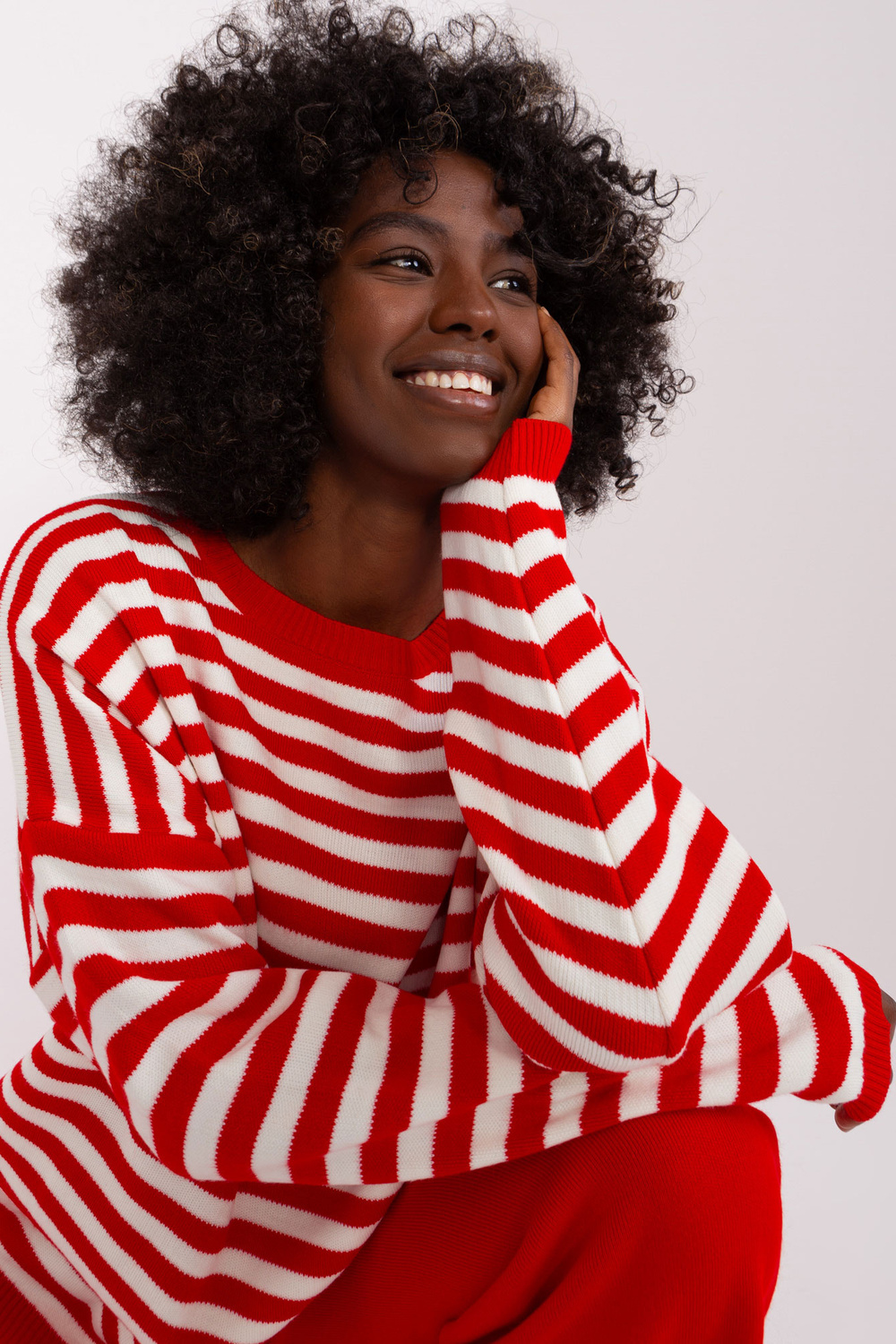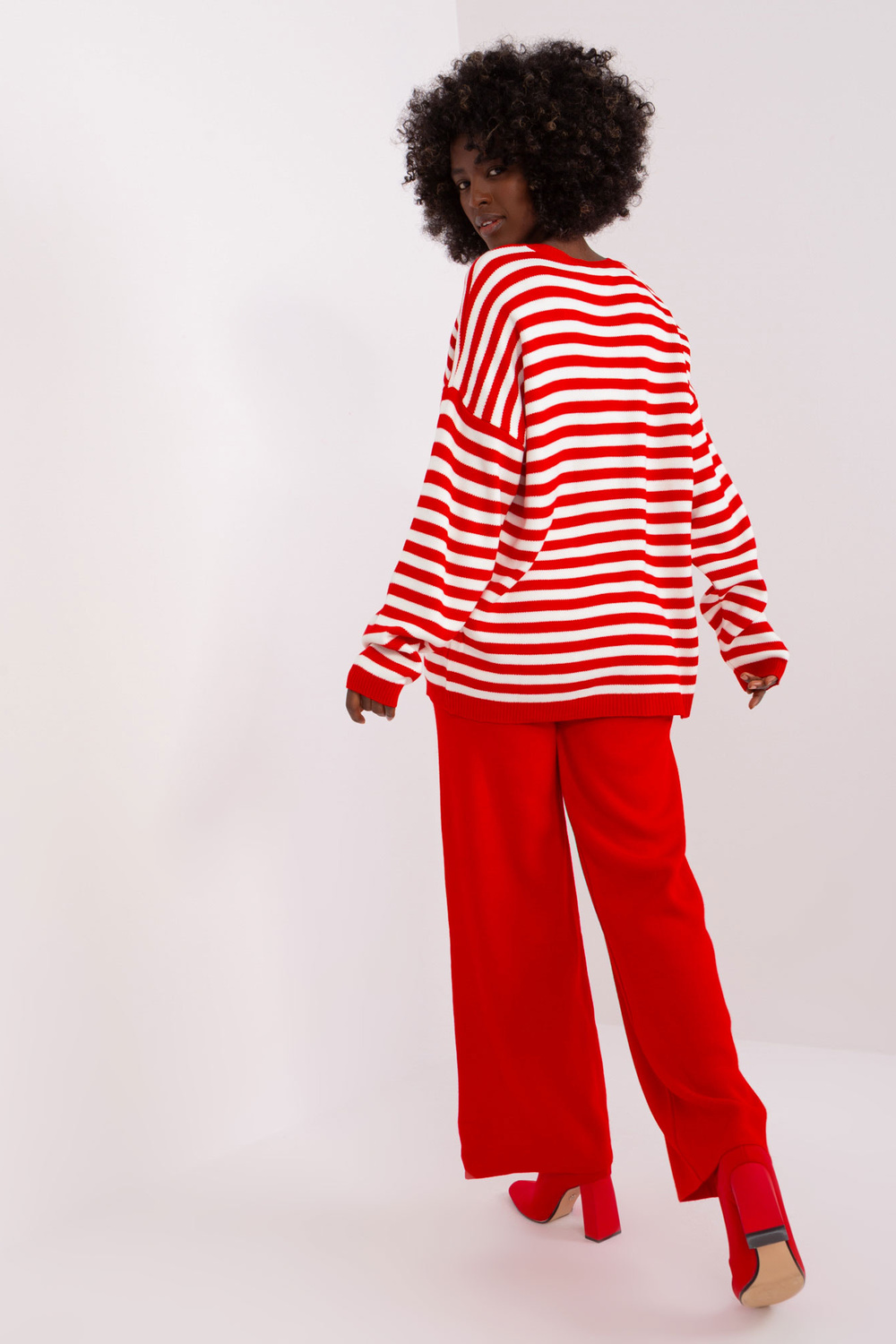 Vieno dydžio komplekto matmenys, matuojamas plokščias: megztinio plotis po pažastimis - 62 cm, rankovės ilgis - 60 cm, megztinio ilgis - 65 cm, kelnių plotis ties juosmeniu - 31 cm, juosmuo aukštis - 37 cm, kelnių ilgis - 105 cm.