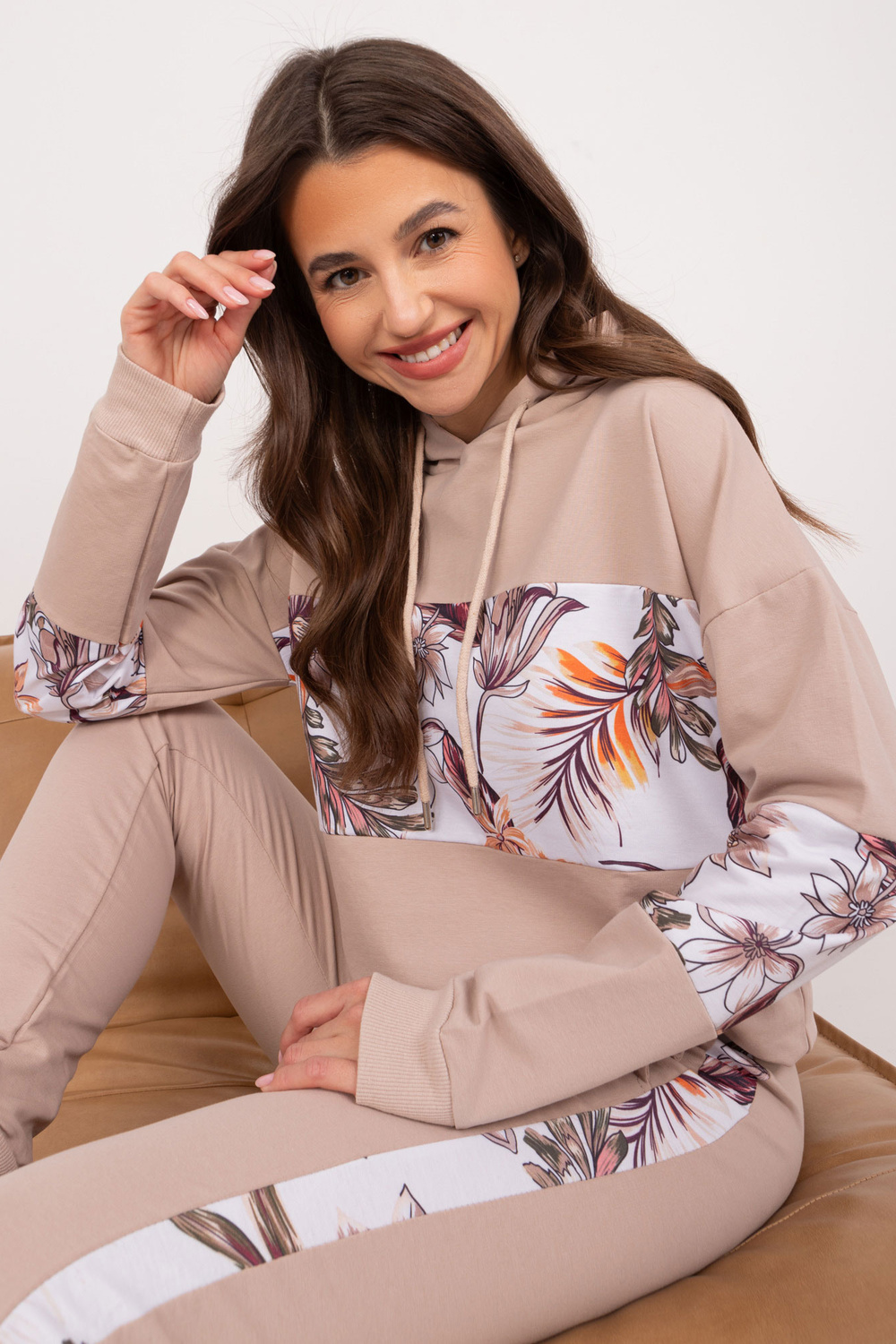 S/M dydžio rinkinio matmenys išmatuoti plokščiai: megztinio plotis po pažastimis - 58 cm, rankovės ilgis - 62 cm, megztinio ilgis - 61 cm, kelnių plotis ties juosmeniu - 38 cm, juosmens aukštis - 28 cm, kelnių ilgis - 99 cm.