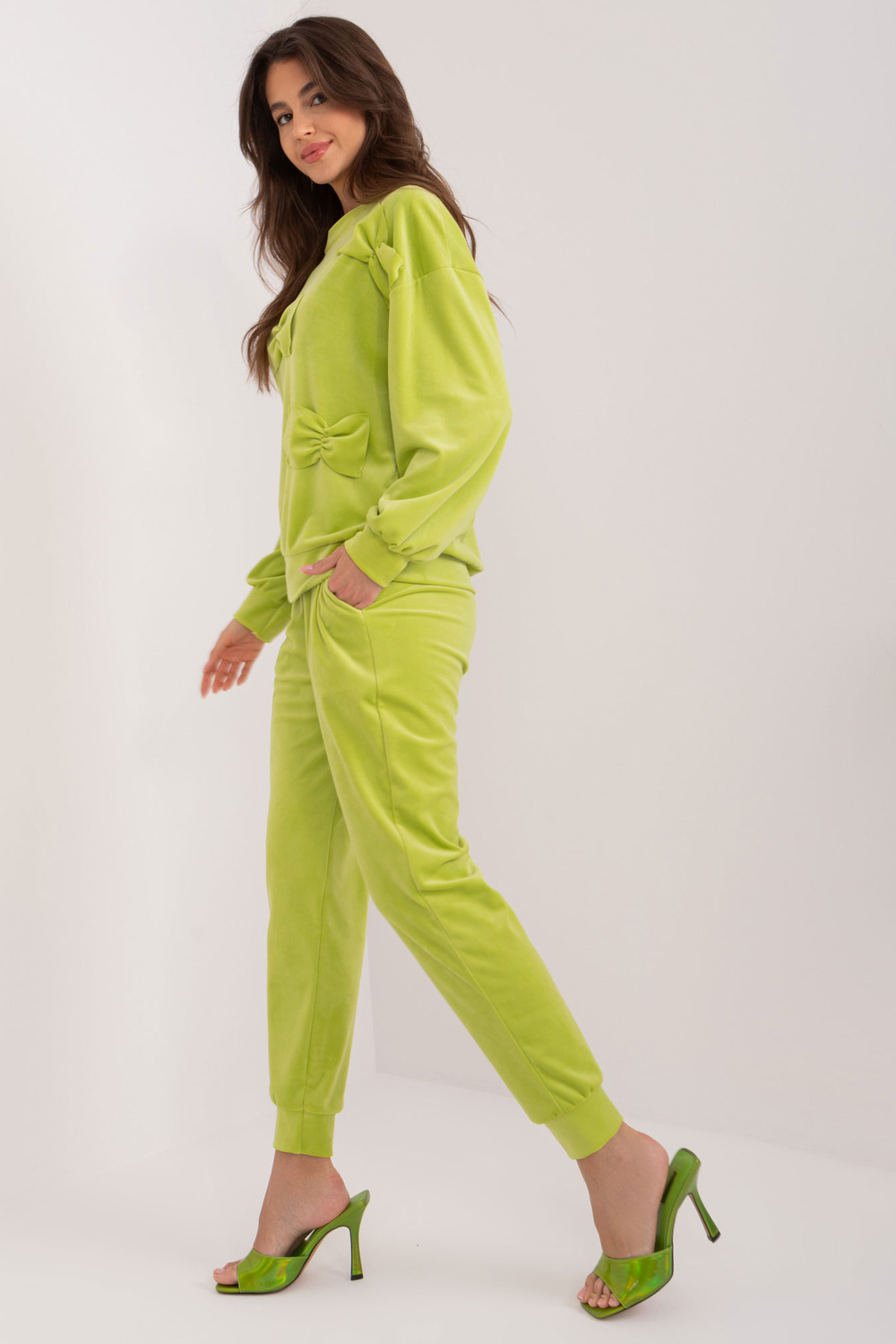 Vieno dydžio komplekto matmenys, matuojamas plokščias: megztinio plotis po pažastimis - 55 cm, megztinio ilgis - 62 cm, rankovių ilgis - 54 cm, juosmens plotis - 37 cm, kelnių ilgis - 94 cm, juosmens aukštis - 31 cm