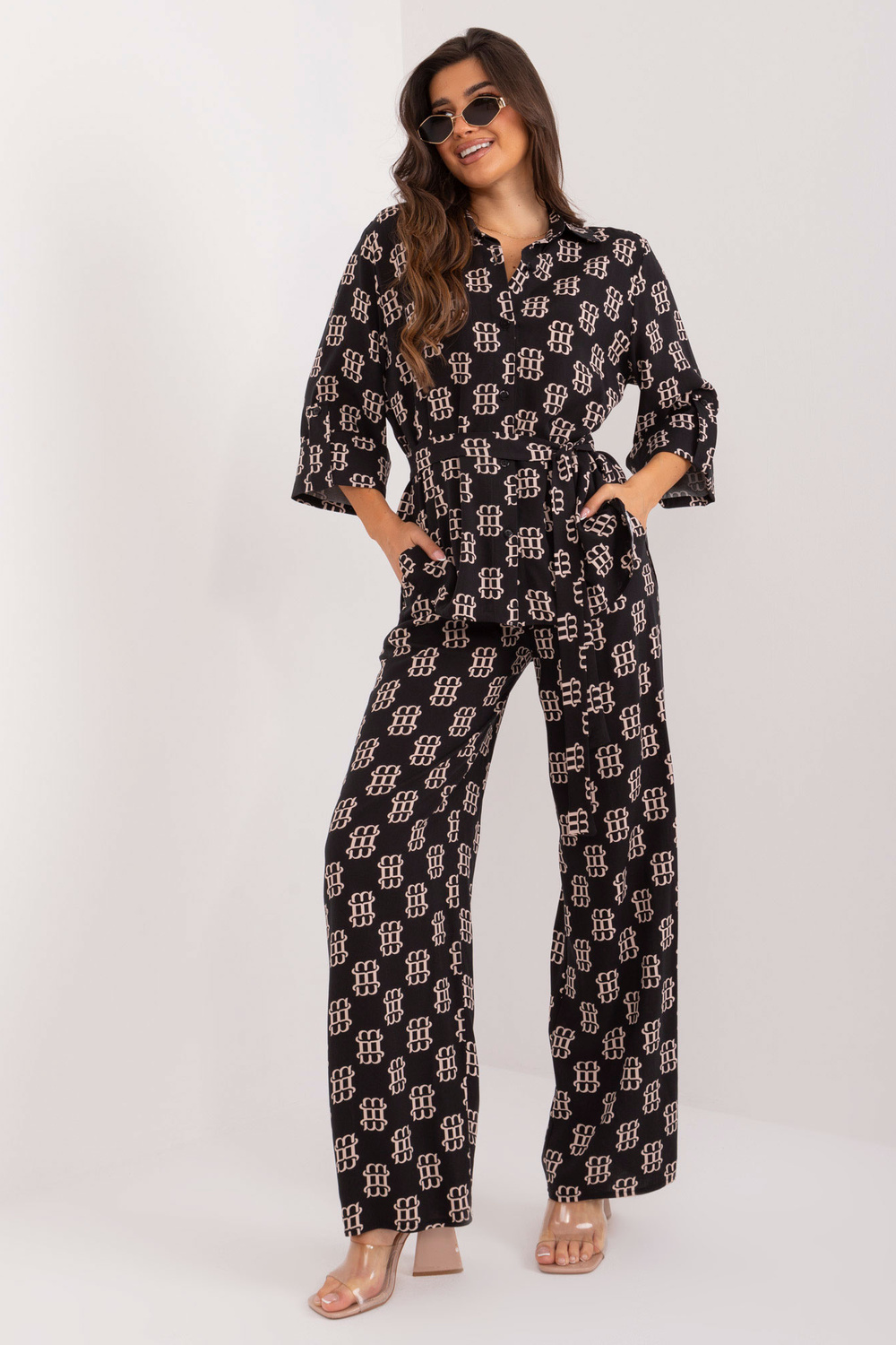S/M dydžio rinkinio matmenys išmatuoti plokščiai: marškinių plotis po pažastimis - 60 cm, rankovių ilgis - 45 cm, marškinių ilgis (priekyje) - 68 cm, marškinių ilgis (nugaroje) - 77 cm, kelnių plotis ties juosmeniu - 34 cm, juosmens aukštis - 34 cm, kelnių ilgis - 113 cm.