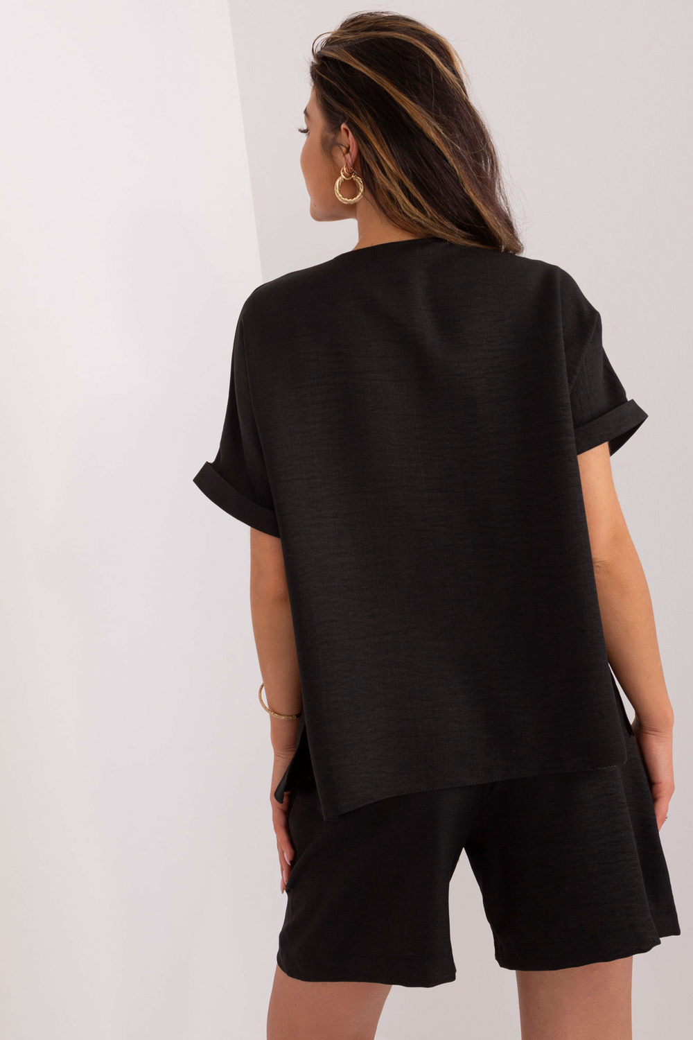 S/M dydžio rinkinio matmenys išmatuoti plokščiai: palaidinės plotis po pažastimis - 63 cm, palaidinės ilgis - 65 cm, šortų plotis ties juosmeniu - 31 cm, juosmens aukštis - 32 cm, ilgis šortai - 45 cm.