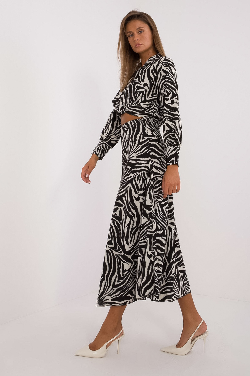 Vieno dydžio rinkinio matmenys, matuojamas plokščias: palaidinės plotis po pažastimis - 51 cm, palaidinės ilgis - 40 cm, rankovės ilgis - 55 cm, sijono plotis ties juosmeniu - 38 cm, ilgis sijono ilgis - 91 cm.