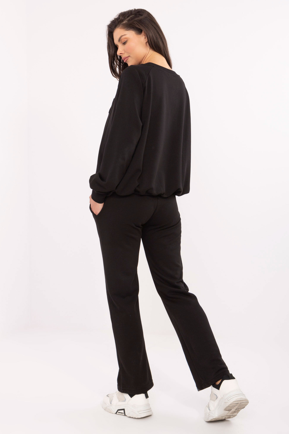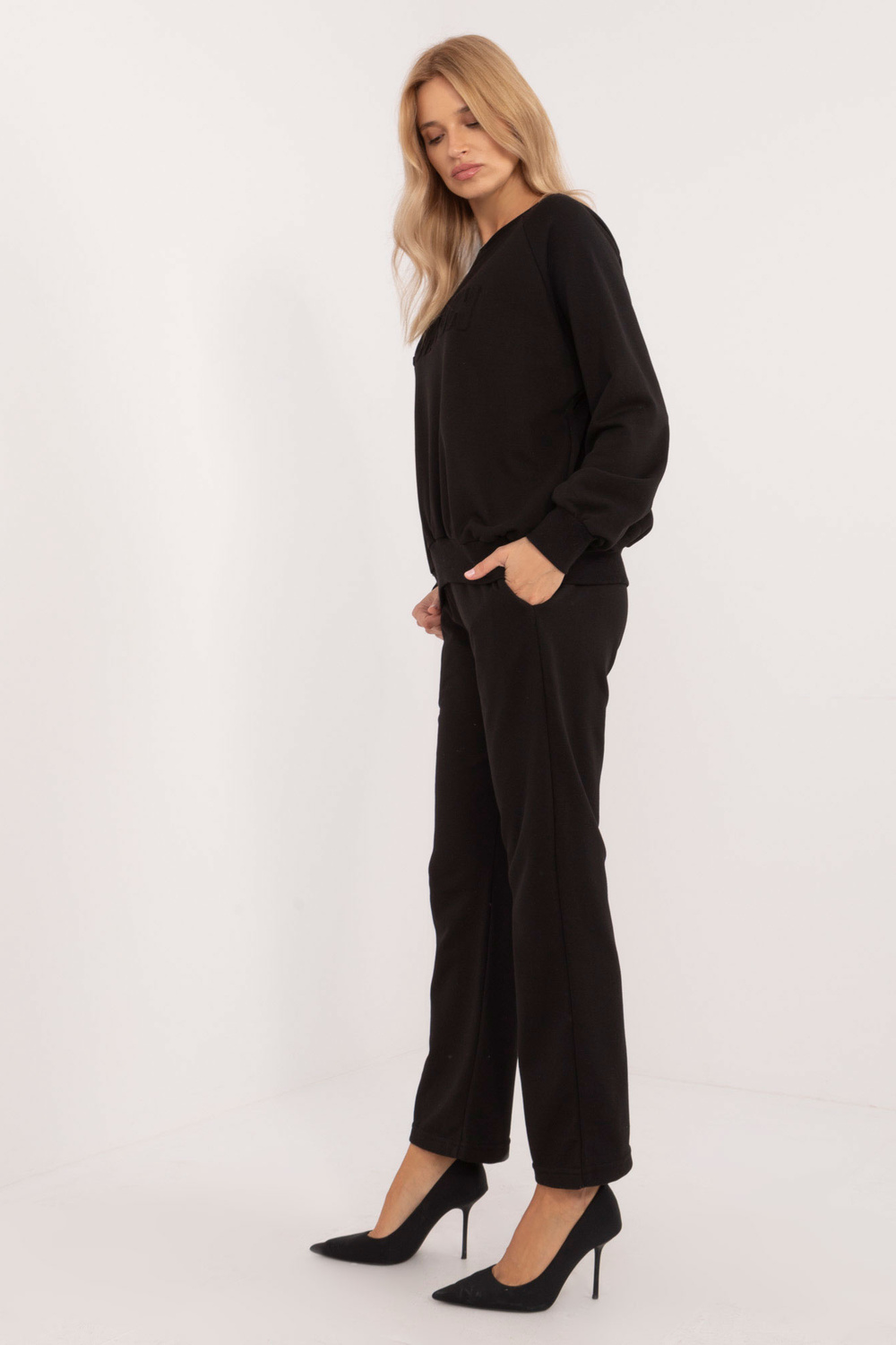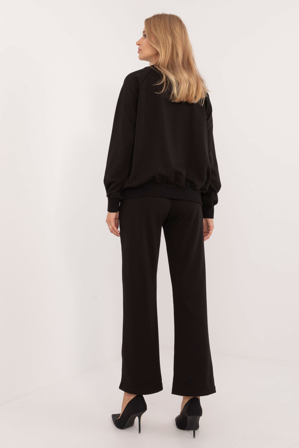 Vieno dydžio komplekto matmenys, matuojamas plokščias: megztinio plotis po pažastimis - 68 cm, megztinio ilgis - 67 cm, rankovių ilgis - 64 cm, kelnių plotis juosmens - 33 cm, juosmens aukštis - 34 cm. , kelnių ilgis - 105 cm.
