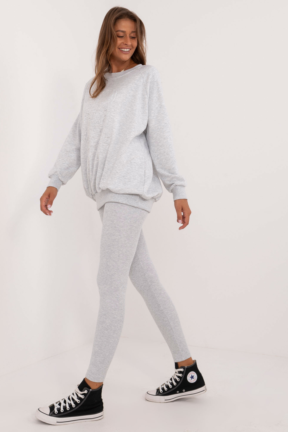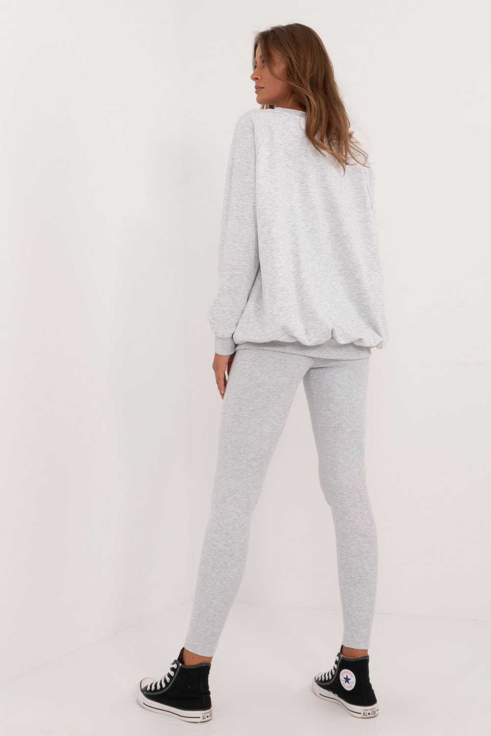 Vieno dydžio komplekto matmenys, matuojami plokščiai: megztinio plotis po pažastimis - 70 cm, megztinio ilgis - 74 cm, rankovių ilgis - 64 cm, antblauzdžių plotis ties juosmeniu - 30 cm, juosmens aukštis - 28 cm, antblauzdžių ilgis - 98 cm.