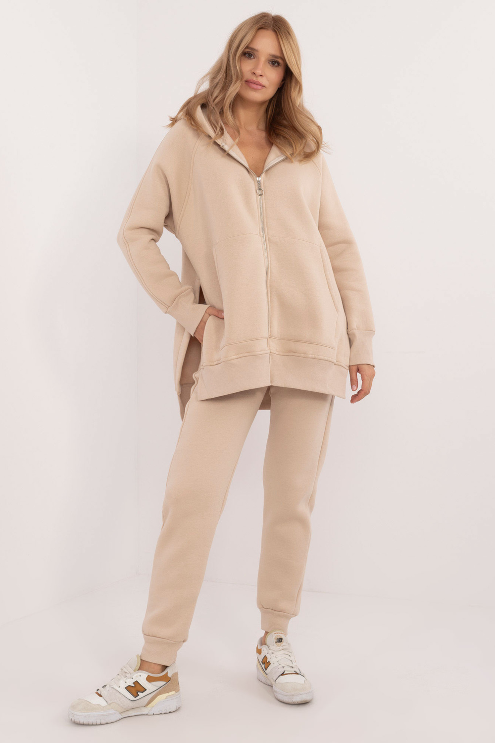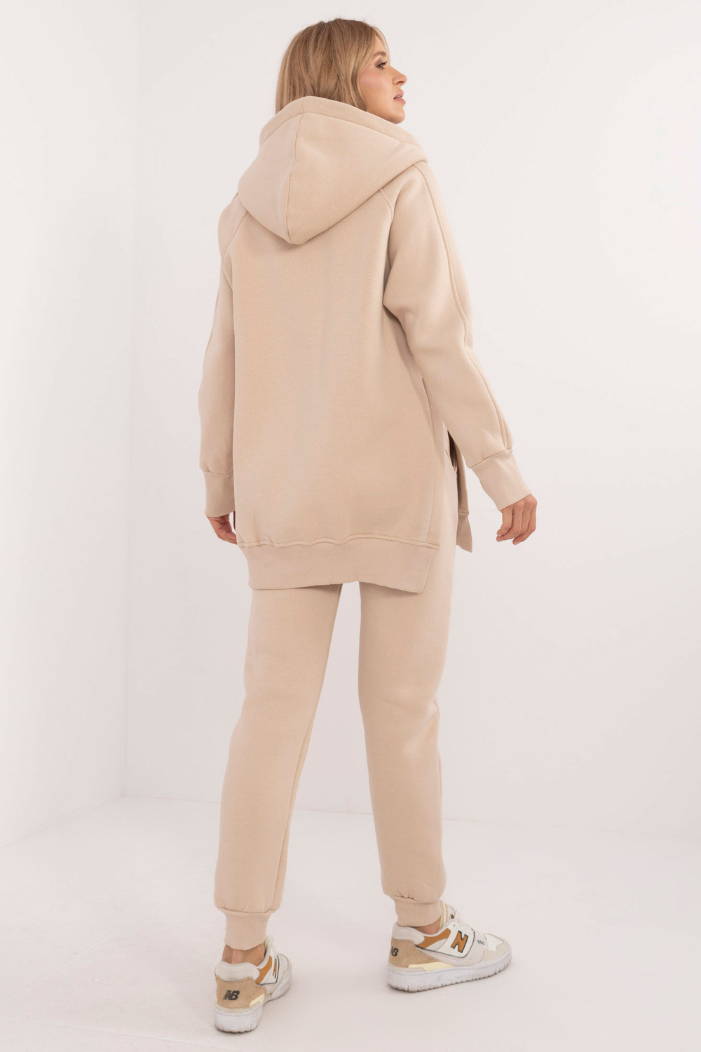 Komplekto matmenys vieno dydžio, matuojamas plokščias: plotis po pažastimis - 62 cm, megztinio ilgis - 77 cm, rankovių ilgis - 63 cm, kelnių plotis ties juosmeniu - 32 cm (plokščias), kelnių plotis ties juosmeniu - 44 cm (po tempimo), kelnių ilgis - 99 cm.