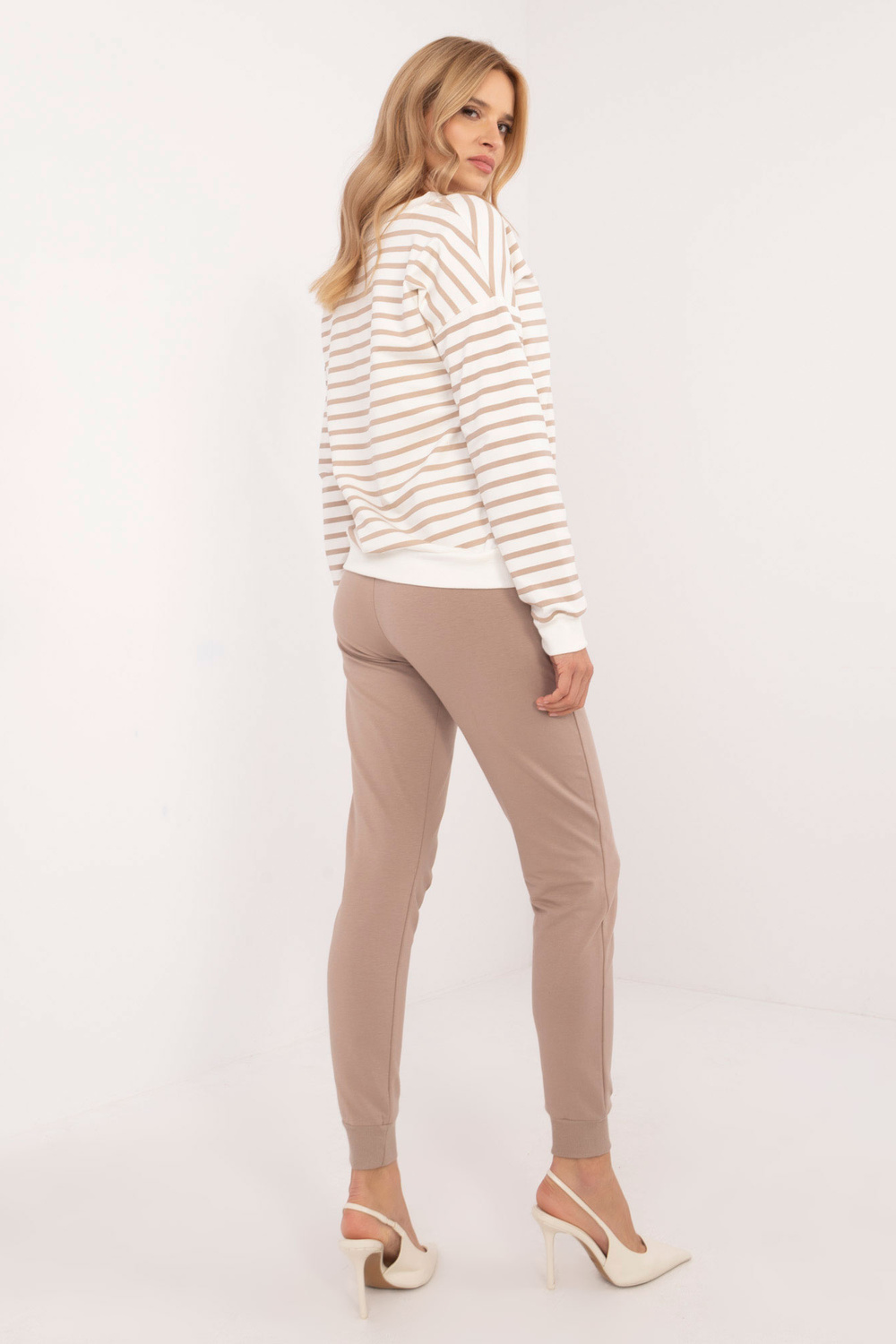 Komplekto matmenys S/M dydžio, matuojamas plokščias: plotis po pažastimis - 55 cm, megztinio ilgis - 62 cm, rankovių ilgis - 59 cm, kelnių juosmens plotis - 36 cm, kelnių ilgis - 97 cm.
