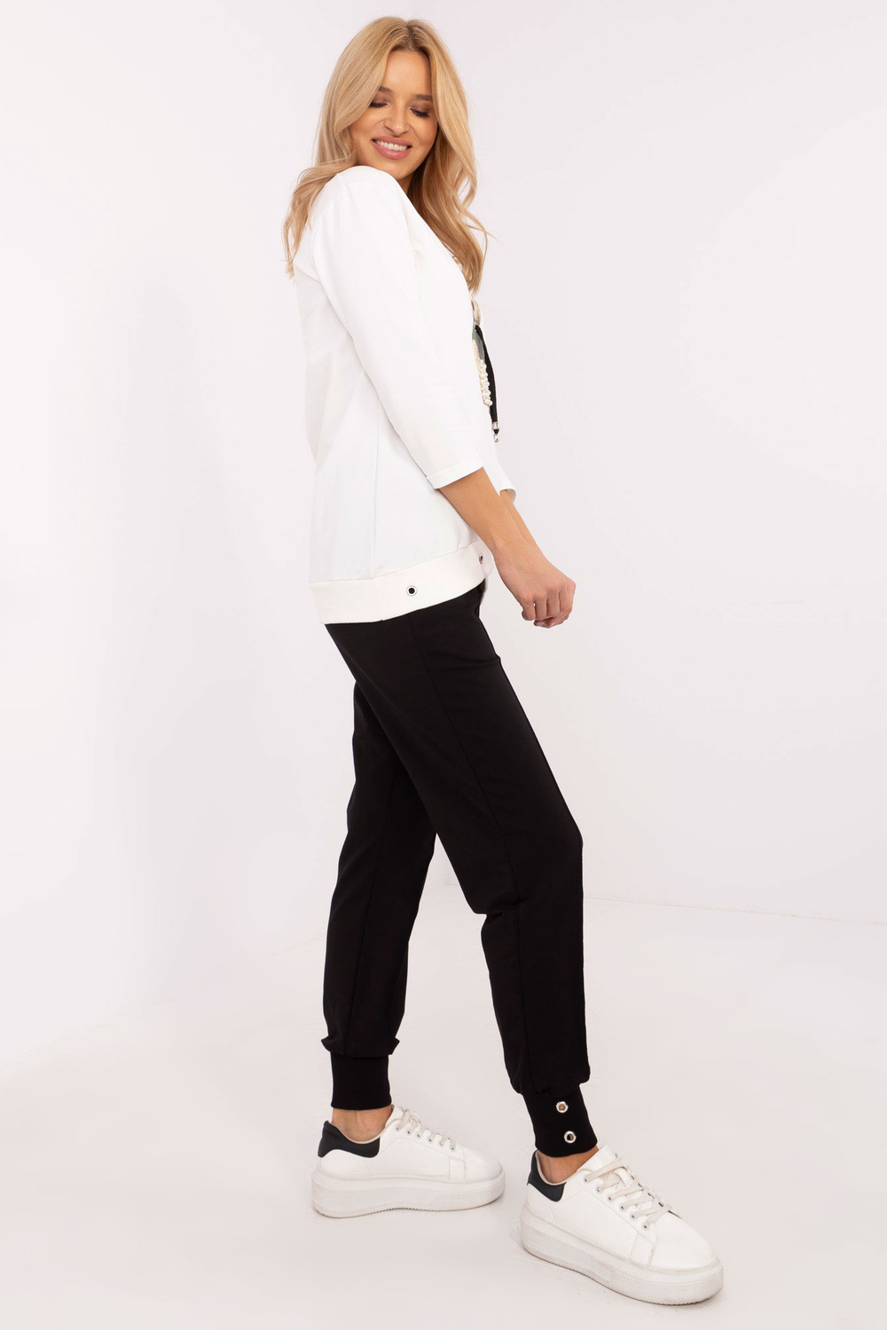 Komplekto matmenys S dydis matuojamas ant plokščio: pažasties plotis - 50 cm, megztinio ilgis - 68 cm (priekyje), megztinio ilgis - 72 cm (nugaroje), rankovių ilgis - 44,5 cm (nuo siūlės), kelnių plotis ties juosmeniu - 34 cm, kelnių ilgis - 99 cm.
