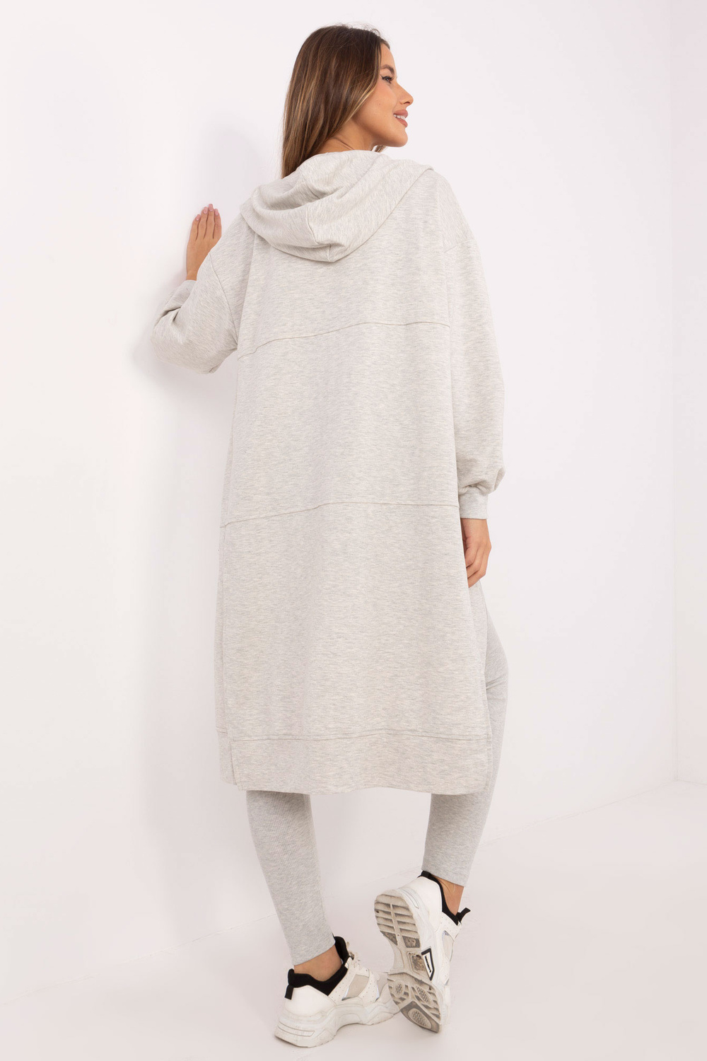 Mezginio matmenys vieno dydžio, matuojamas plokščias: megztinio plotis po apačia rankos - 57 cm, megztinio ilgis - 107 cm, rankovių ilgis - 52 cm, klubų apimtis - 108 cm.