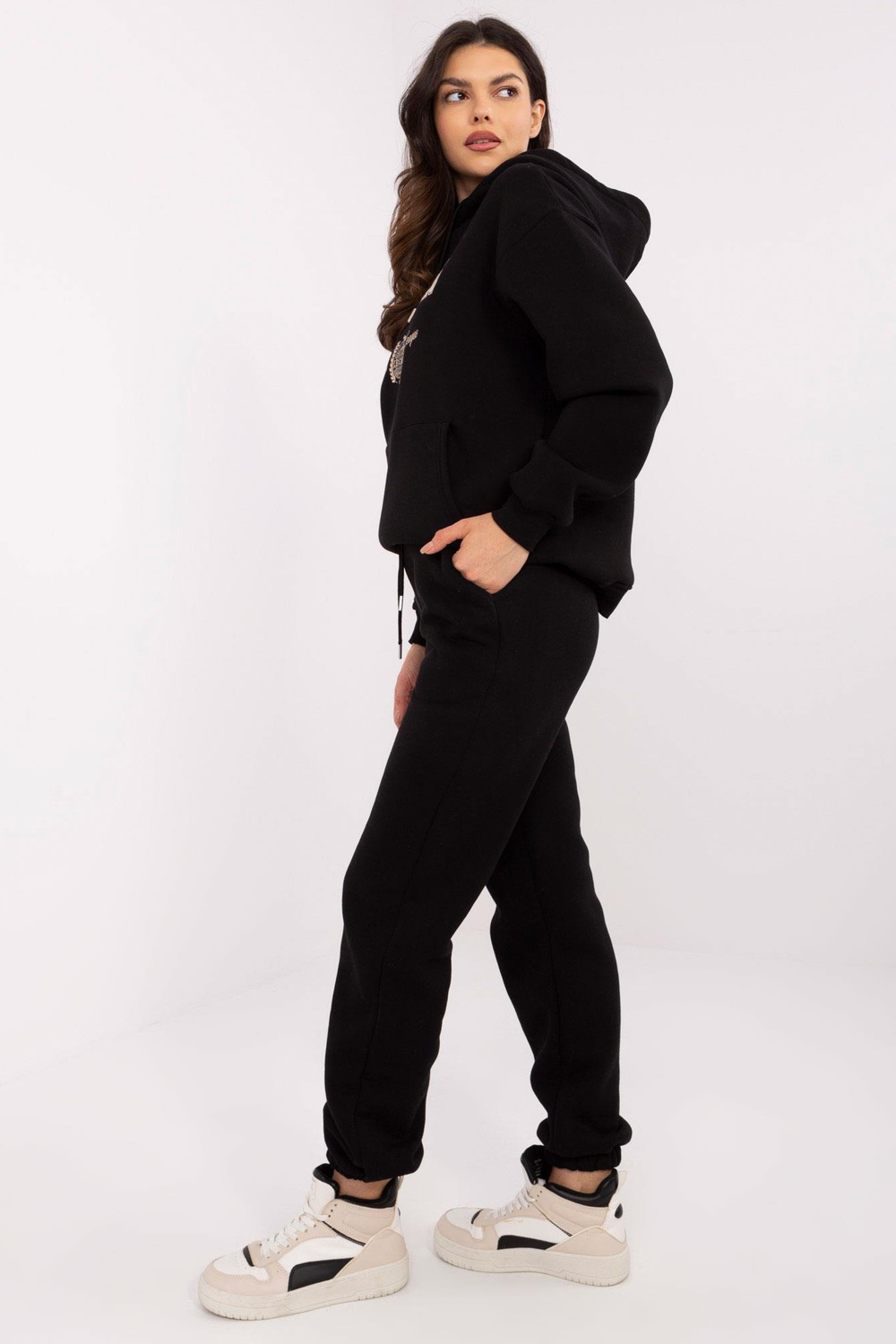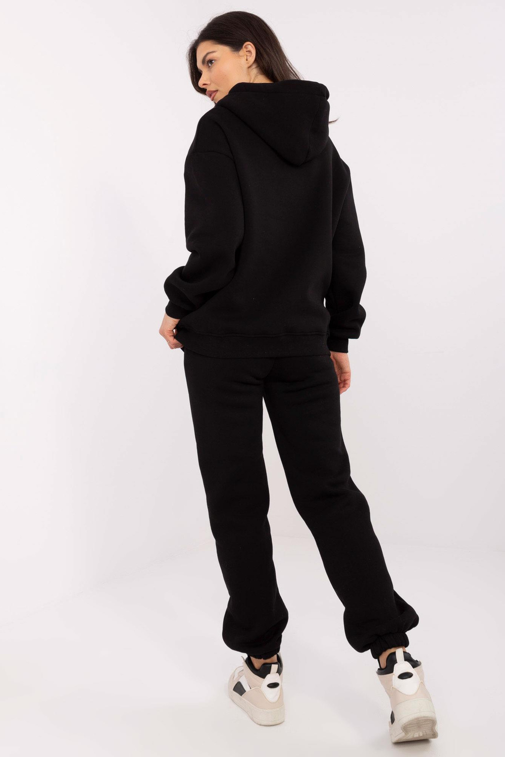 Komplekto matmenys S dydžio: megztinio plotis po pažastimis - 58 cm, rankovės ilgis - 57 cm, ilgis - 7 cm. 34 cm, kelnių plotis ties klubais - 48 cm, kelnių ilgis - 103 cm.