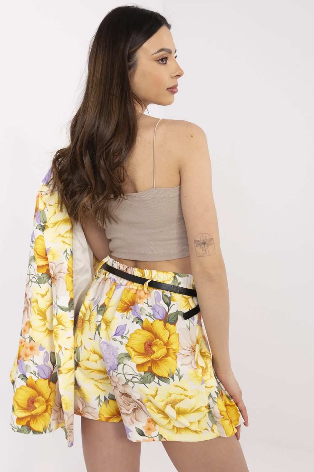 Modelis dėvi vieno dydžio dydį. Modelio išmatavimai: ūgis 175 cm, krūtinė 84 cm, juosmuo 61 cm, klubai 91 cm.