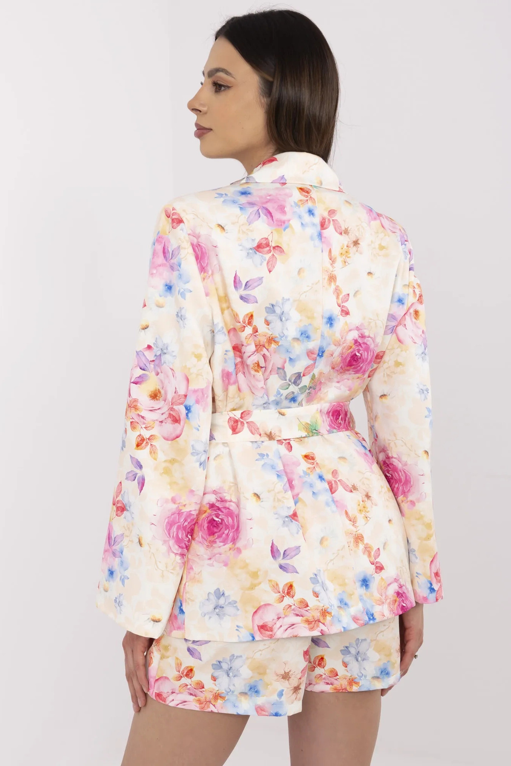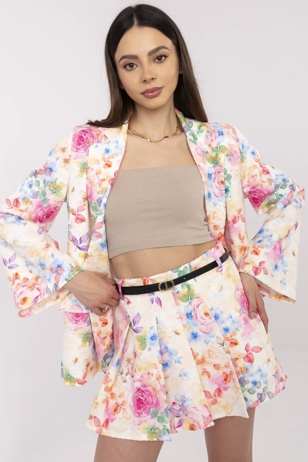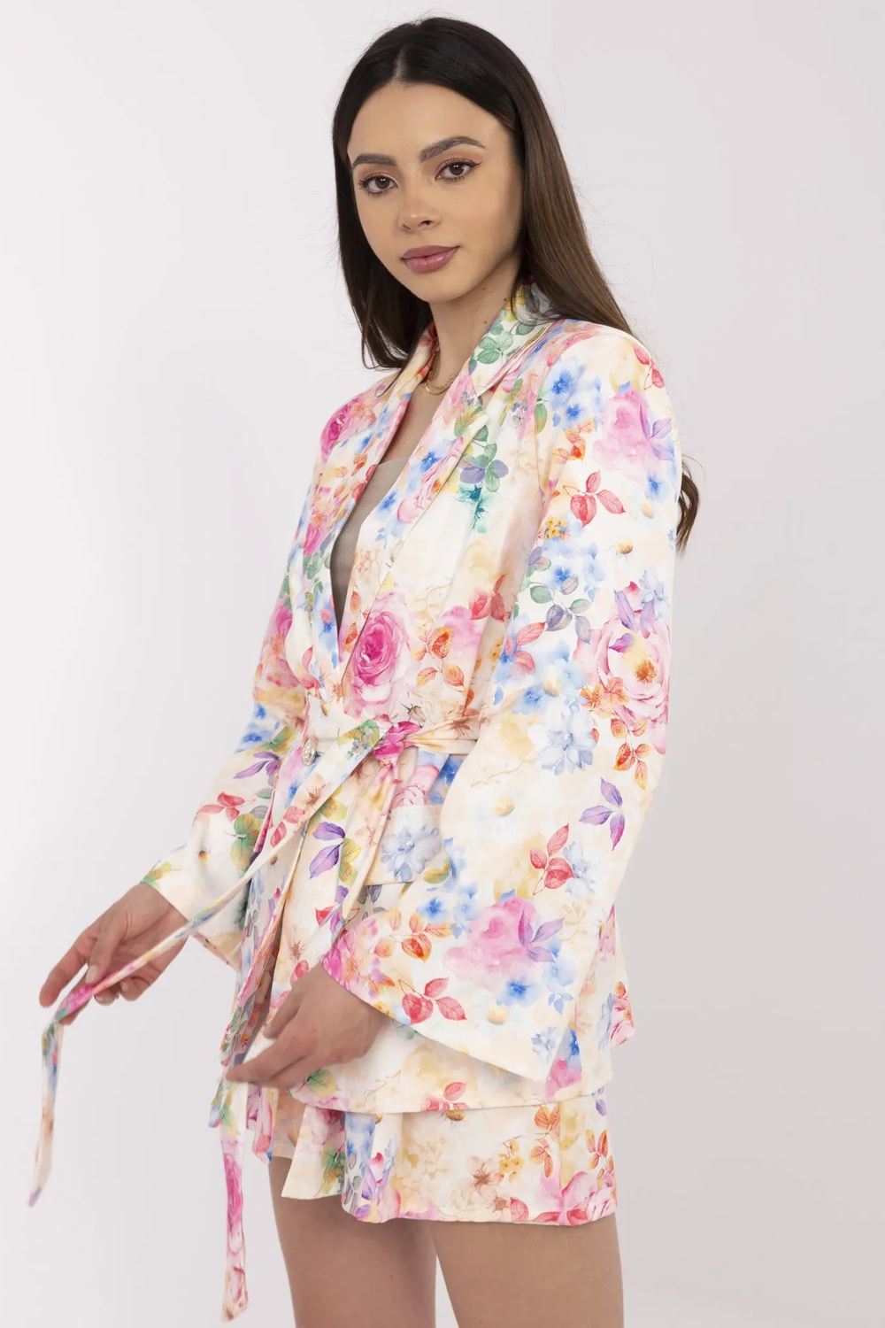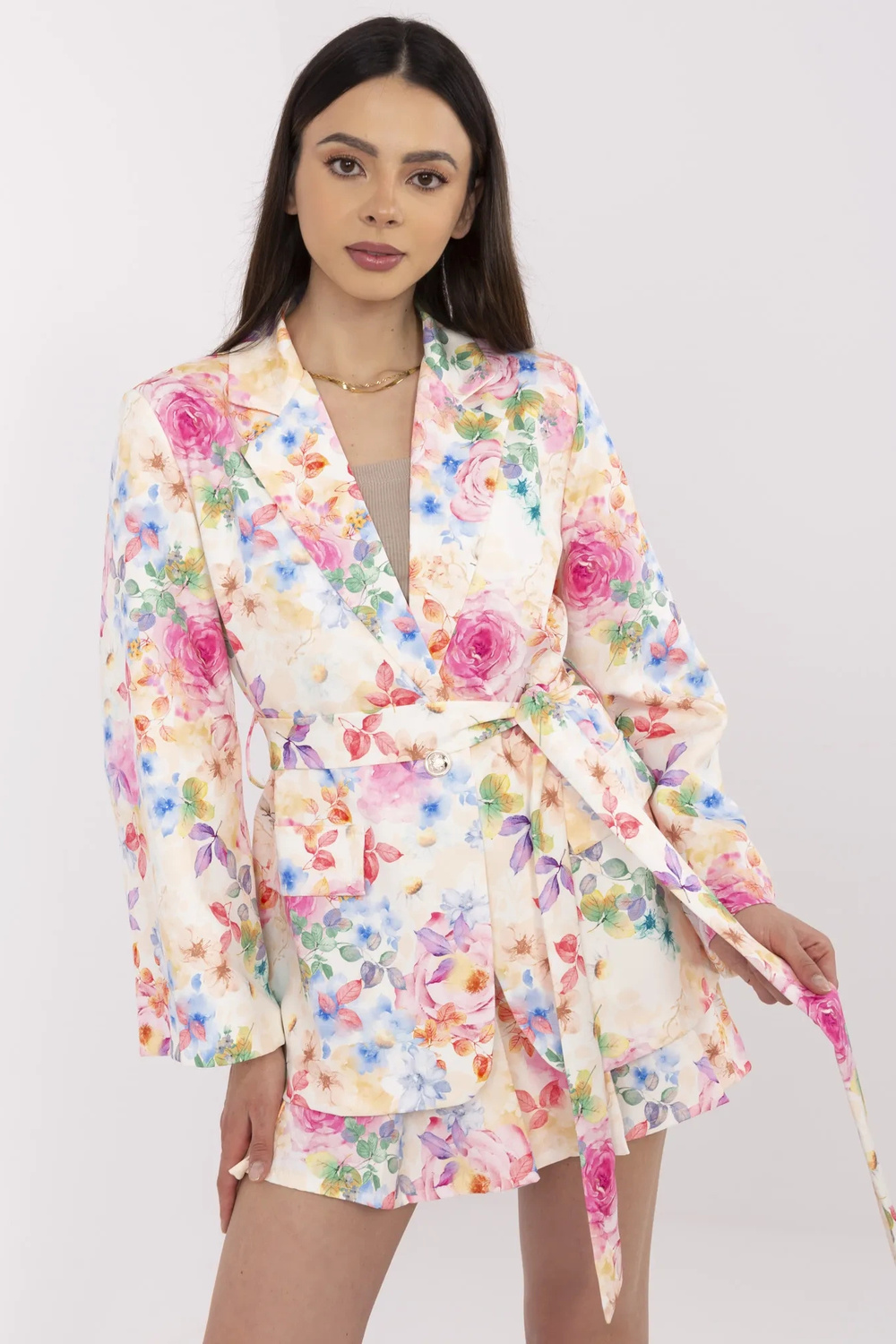 Modelis dėvi vieno dydžio dydį. Modelio išmatavimai: ūgis 175 cm, krūtinė 84 cm, juosmuo 61 cm, klubai 91 cm.