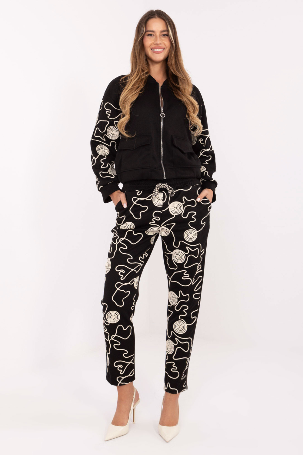 Komplekto matmenys universalaus dydžio: plotis po pažastimis - 61 cm, bluzonos ilgis - 57 cm, rankovės ilgis - 54 cm (nuo siūlės), plotis klubų srityje - 54 cm, kelnių plotis juosmens srityje - 37 cm (gulsčiai), kelnių plotis juosmens srityje - 56 cm (ištempus), plotis klubų srityje - 54 cm, kelnių ilgis - 100 cm.