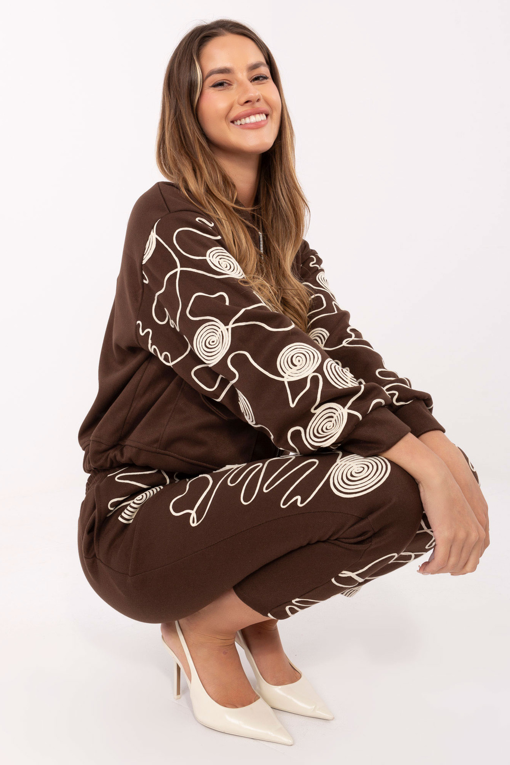 Komplekto matmenys (vienas dydis): plotis po pažastimis - 61 cm, džemperio ilgis - 57 cm, rankovės ilgis - 54 cm (nuo siūlės), plotis klubų srityje - 54 cm, kelnių plotis liemens srityje - 37 cm (padėjus), kelnių plotis liemens srityje - 56 cm (ištempus), klubų plotis - 54 cm, kelnių ilgis - 100 cm.