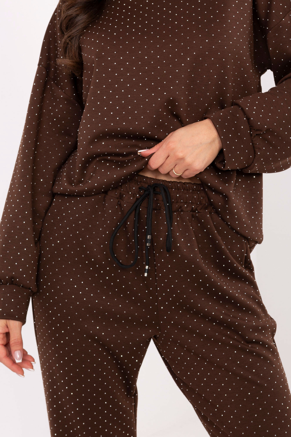 Komplekto matmenys universalaus (one size) dydžio: plotis po pažastimis – 63 cm, bluzonų ilgis – 65 cm, rankovės ilgis – 44 cm (nuo siūlės), klubų plotis – 52 cm, kelnių liemens plotis – 35 cm (tiesiai), kelnių liemens plotis – 75 cm (ištempus), klubų plotis – 55 cm, kelnių ilgis – 94 cm.