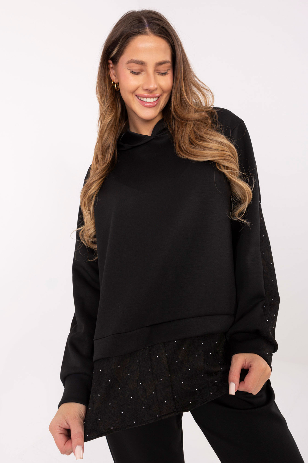 Modelis dėvi vieno dydžio drabužį. Modelio išmatavimai: ūgis 176 cm, krūtinė 90 cm, liemuo 62 cm, klubai 94 cm.