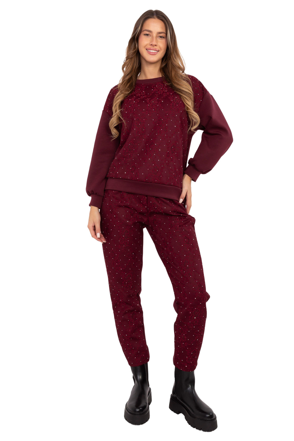 Vieno dydžio komplekto matmenys: plotis po pažastimis – 55 cm, megztinio ilgis – 65 cm, rankovės ilgis – 48 cm (nuo siūlės), klubų plotis – 45 cm, kelnių liemens plotis – 37 cm (išlygintas), kelnių liemens plotis – 91 cm (ištemptas), klubų plotis – 54 cm, kelnių ilgis – 99 cm.