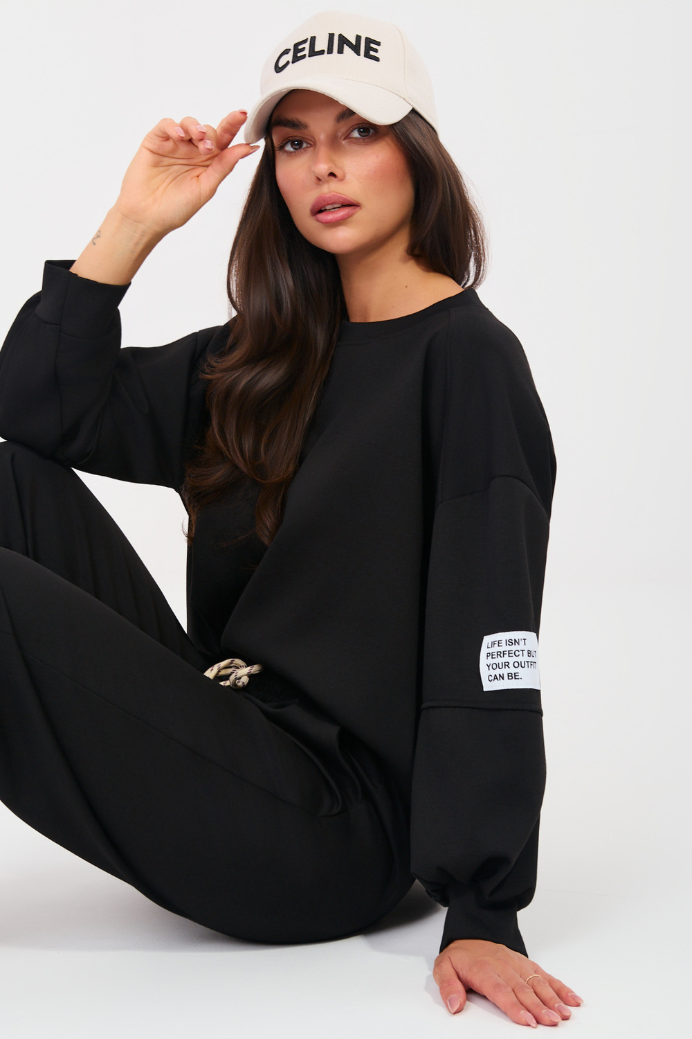 Modelis dėvi vieno dydžio drabužį. Modelio išmatavimai: aukštis 173 cm, krūtinė 85 cm, liemuo 62 cm, klubai 95 cm .