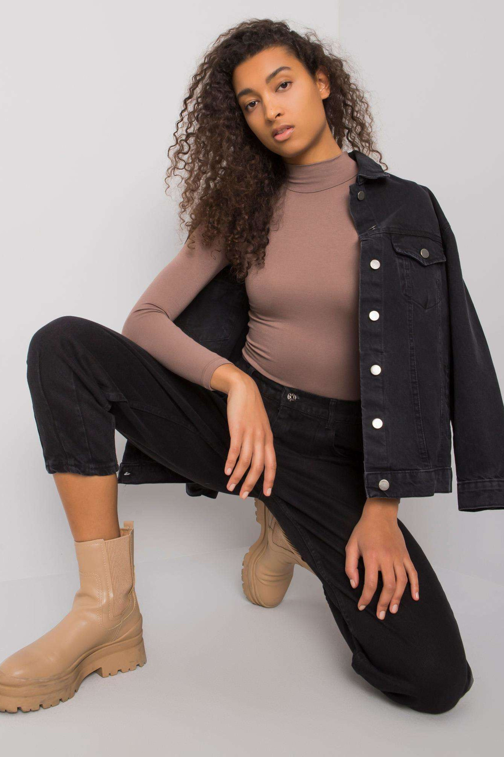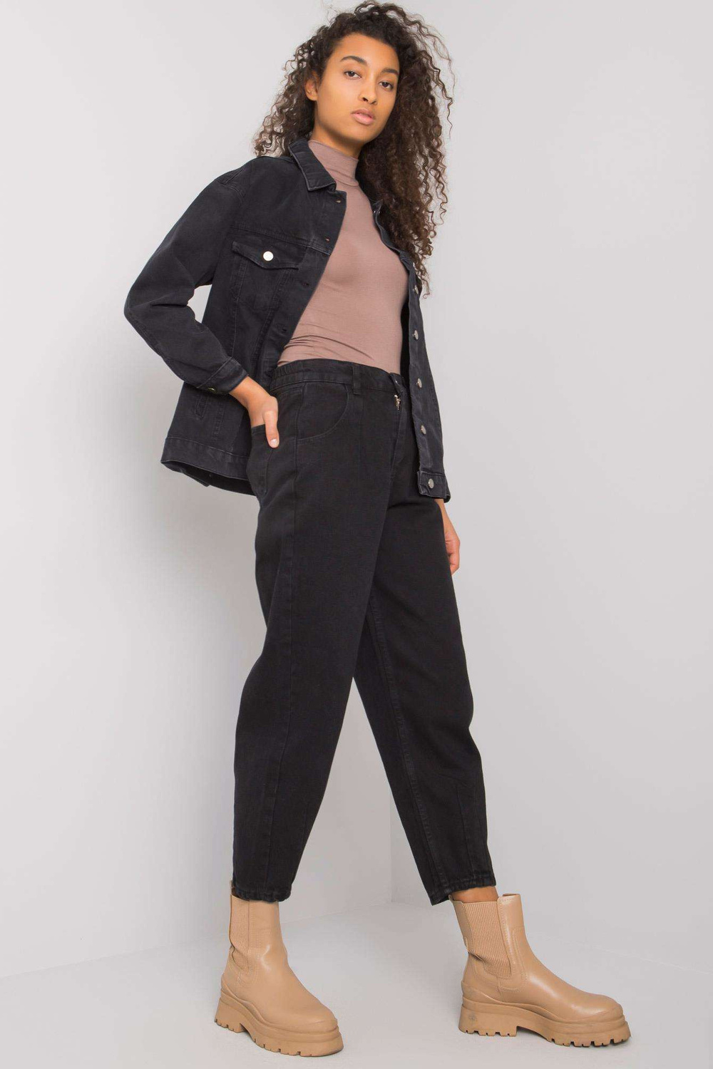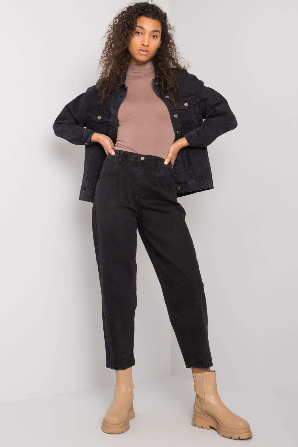 Modelis dėvi 27 dydį. modelio matmenys: aukštis 178 cm, krūtinė 82 cm, juosmuo 61 cm, klubai 88 cm.
