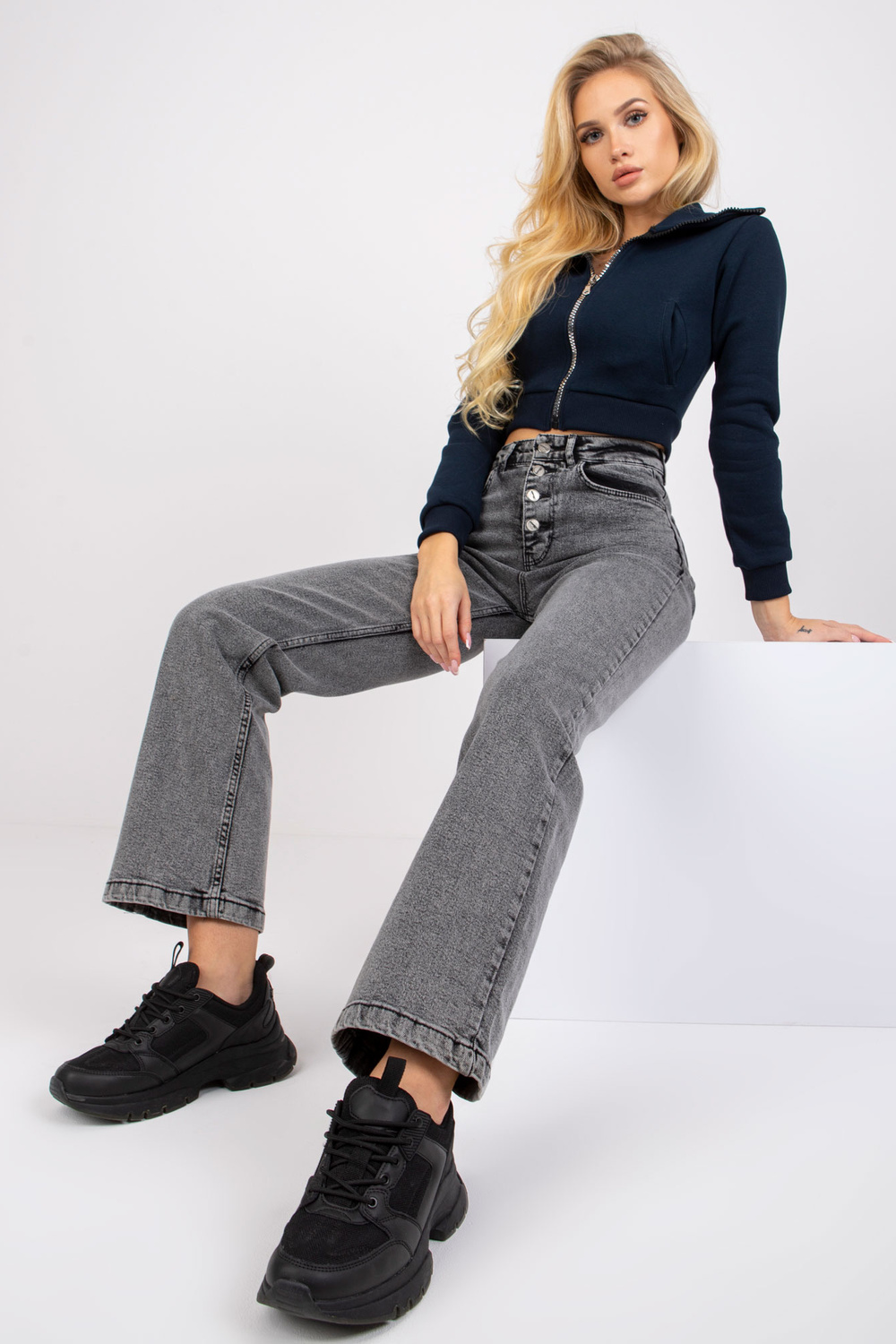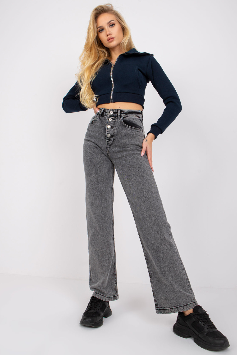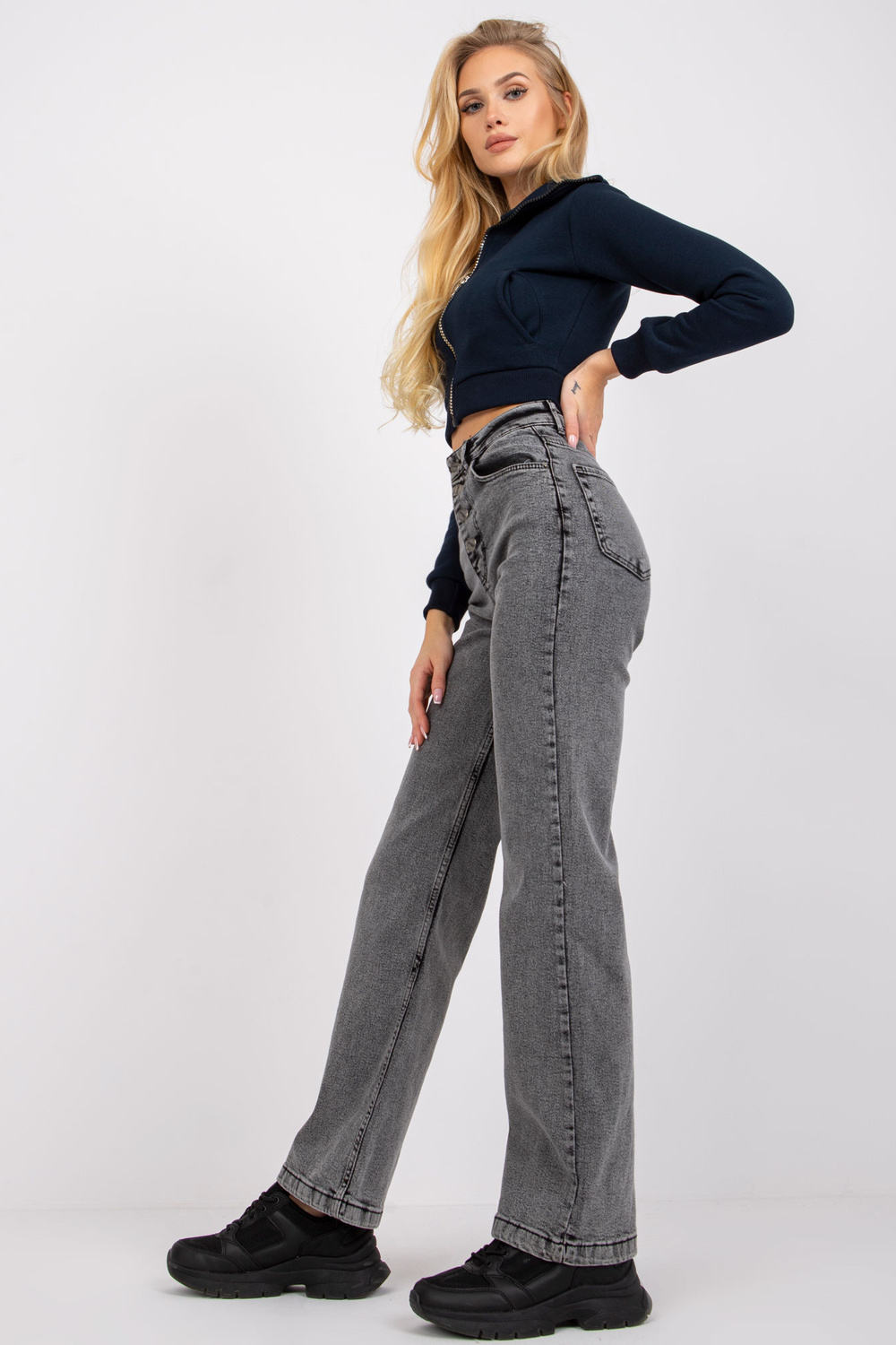 Tamsiai pilki džinsai aukštu juosmeniu Sevilijos stiliaus.