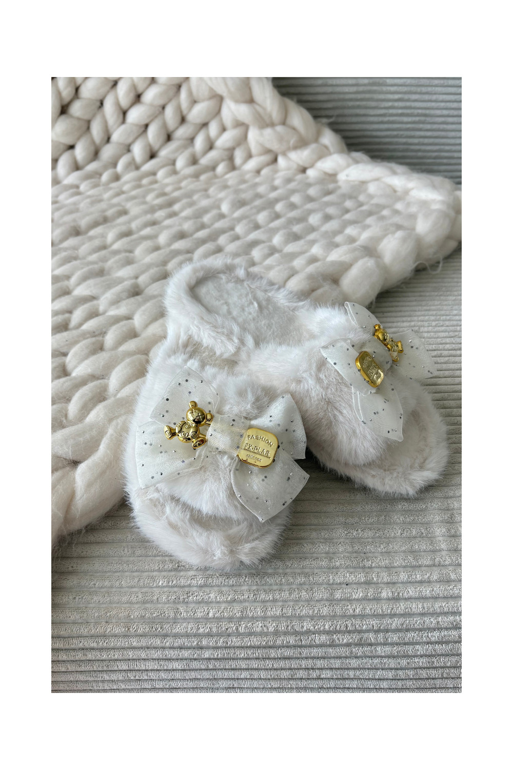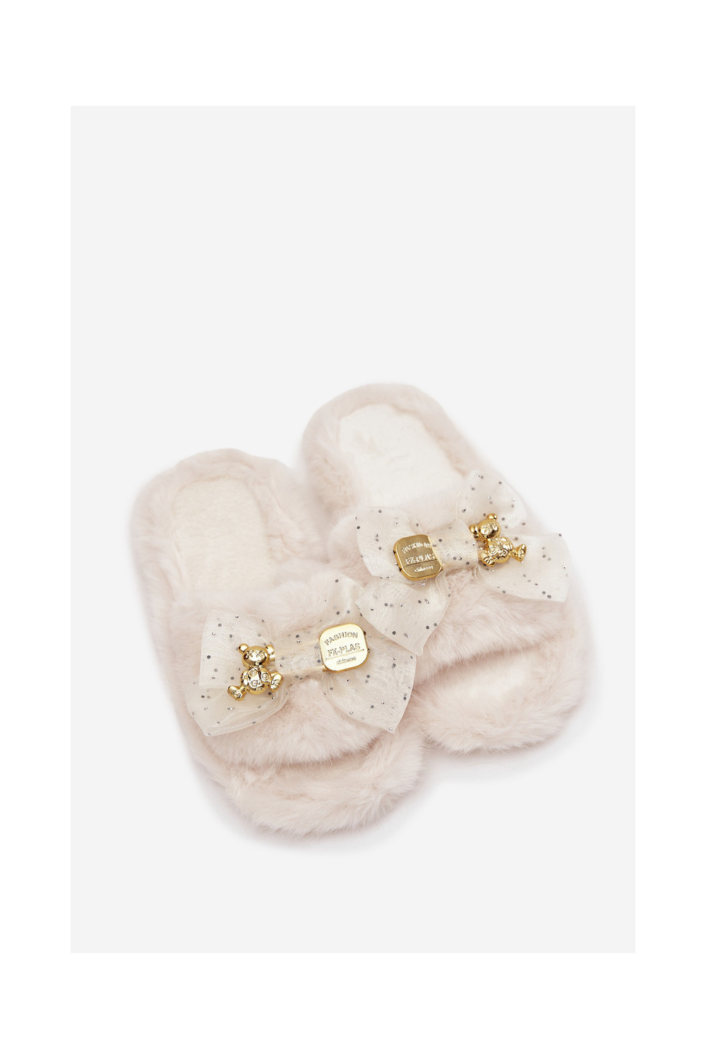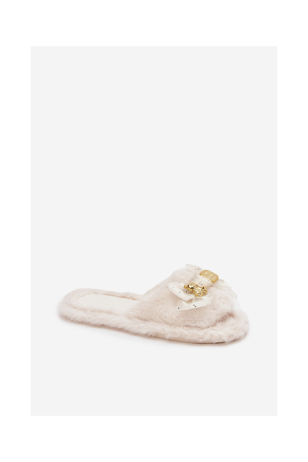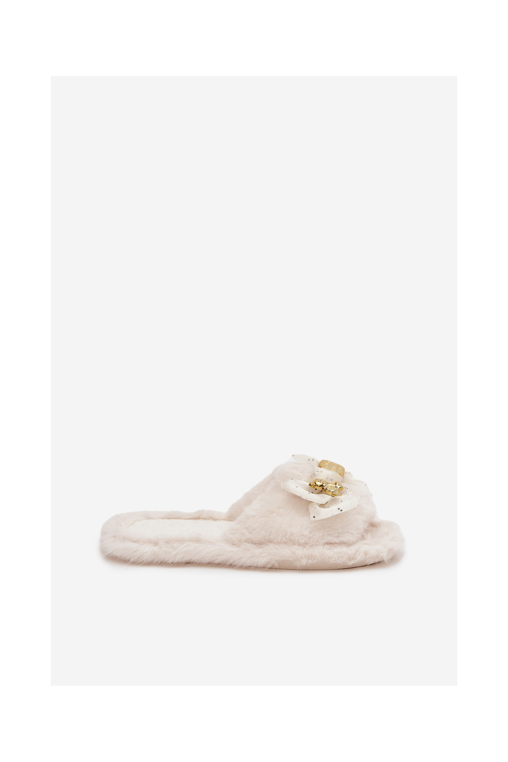 Dramblio kaulo spalvos moteriškos šlepetės su kailiuku, kaspinais ir aukso puošyba „Nolara"