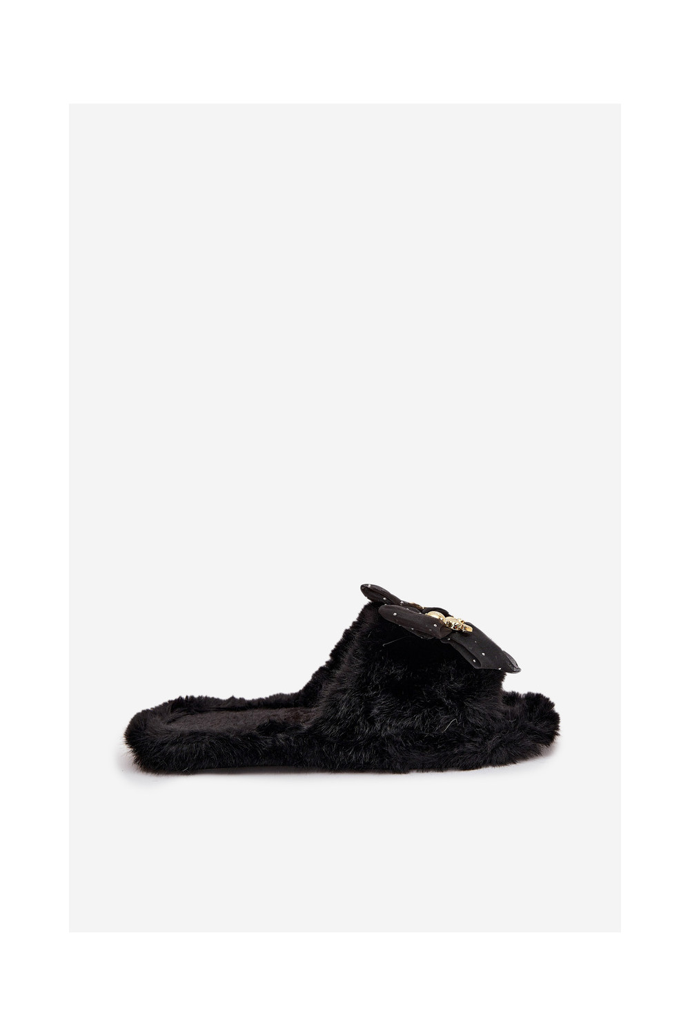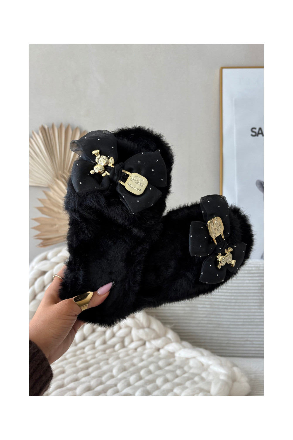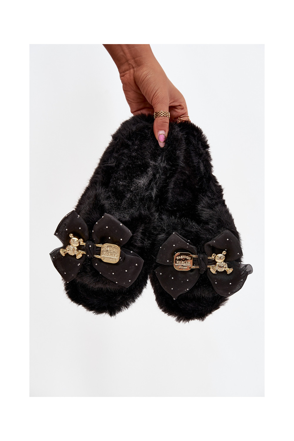 Juodos spalvos moteriškos šlepetės su kailiuku, kaspinais ir aukso puošyba „Nolara"