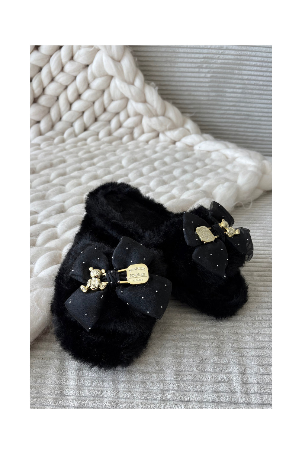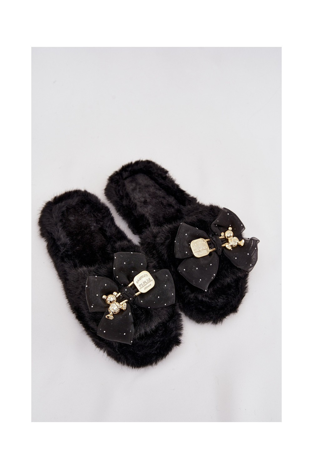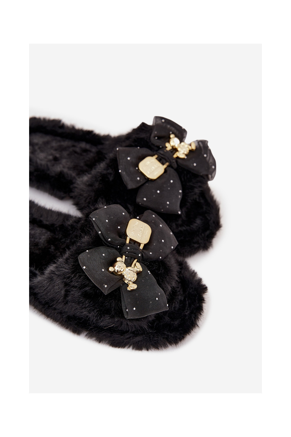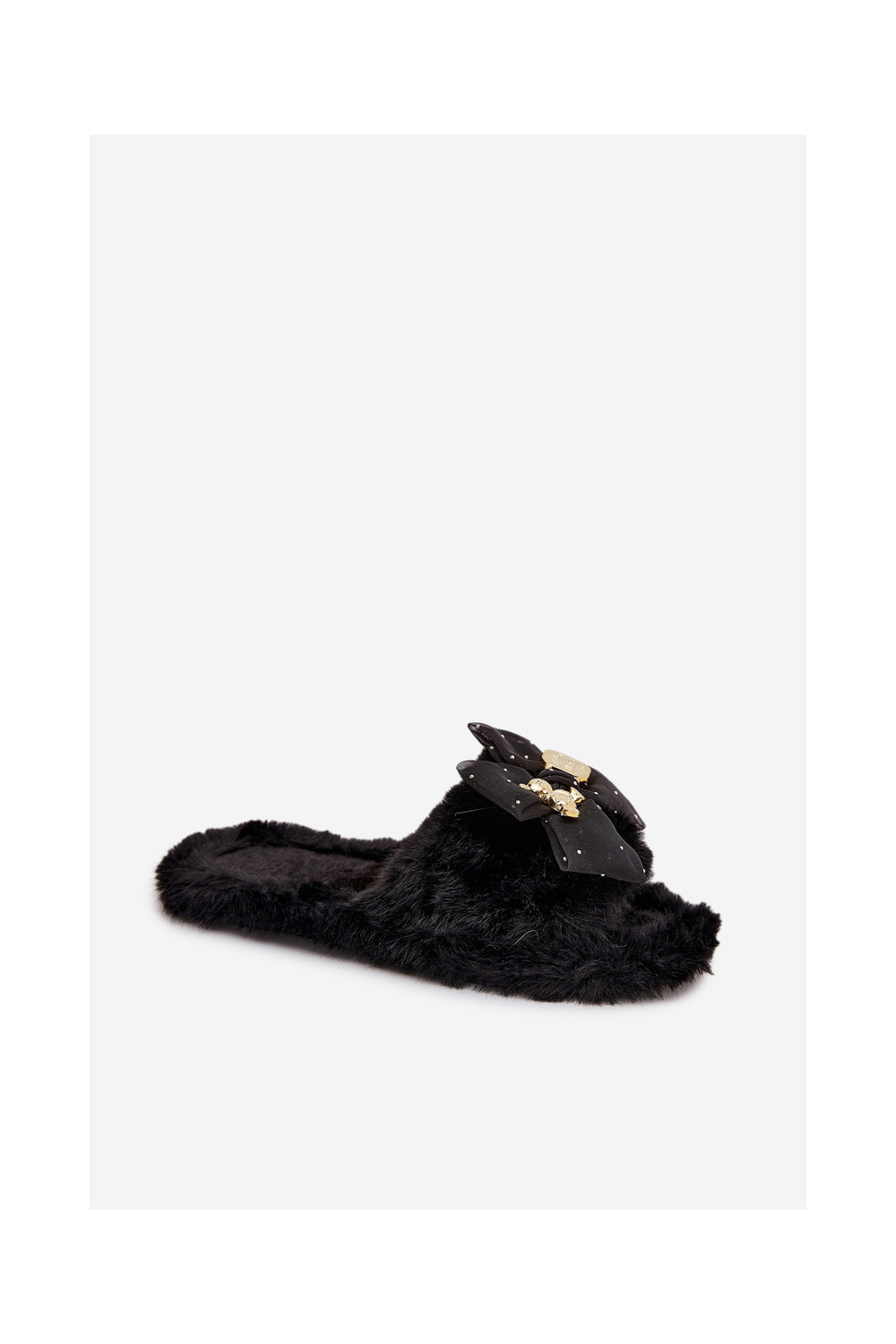 Juodos spalvos moteriškos šlepetės su kailiuku, kaspinais ir aukso puošyba „Nolara"