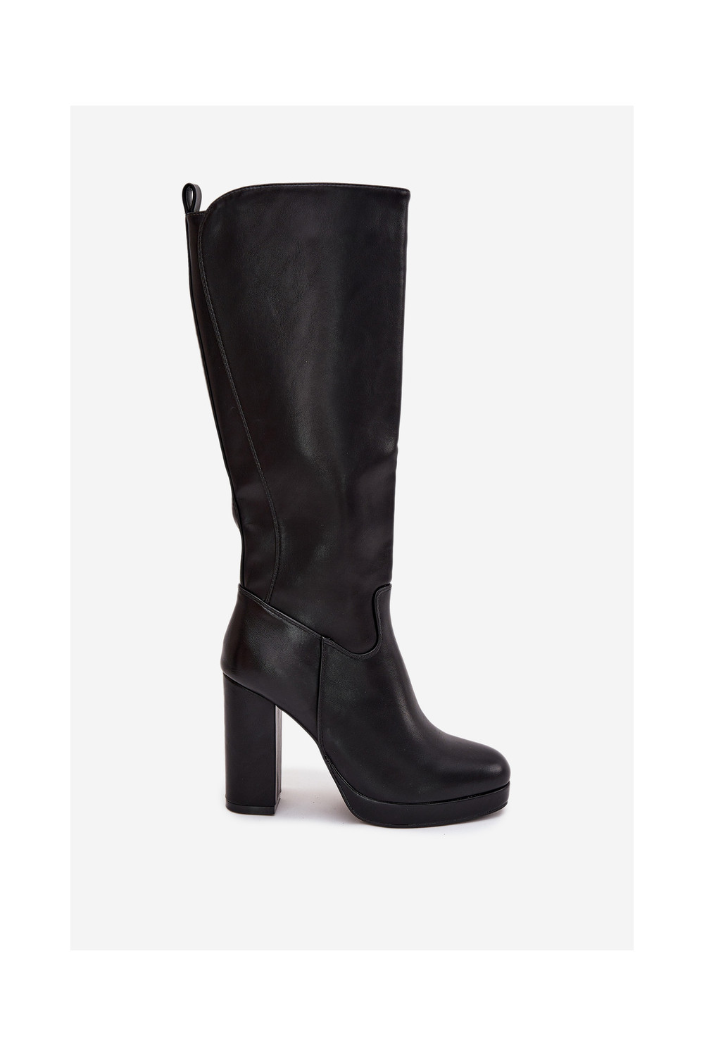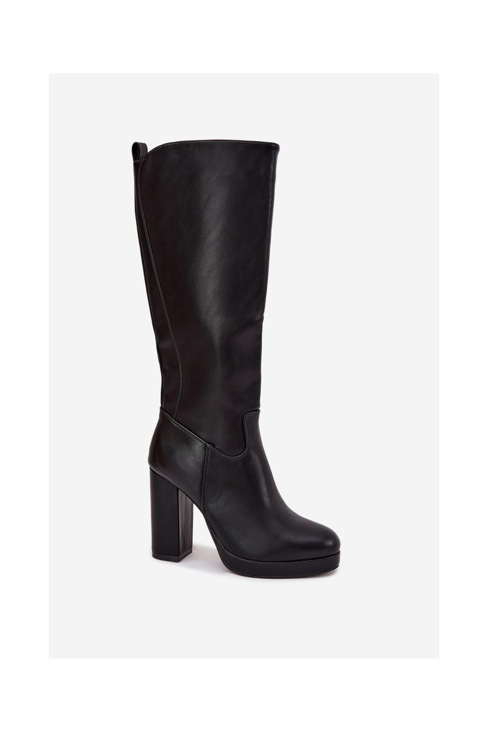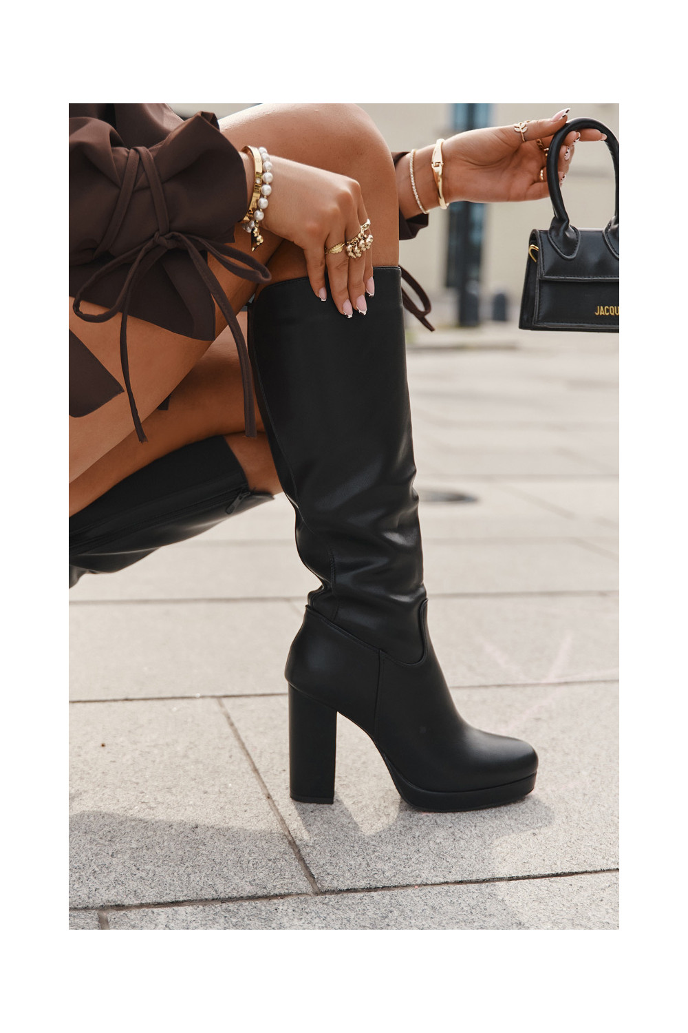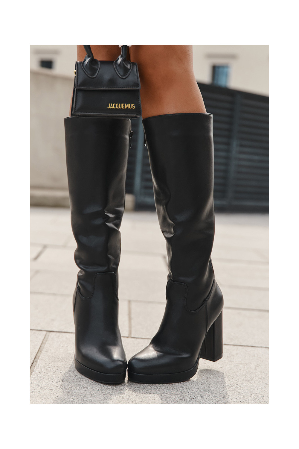 Moteriški ilgaauliai batai iki kelių su kulniukais, dirbtinės odos, juodos spalvos Thalina
