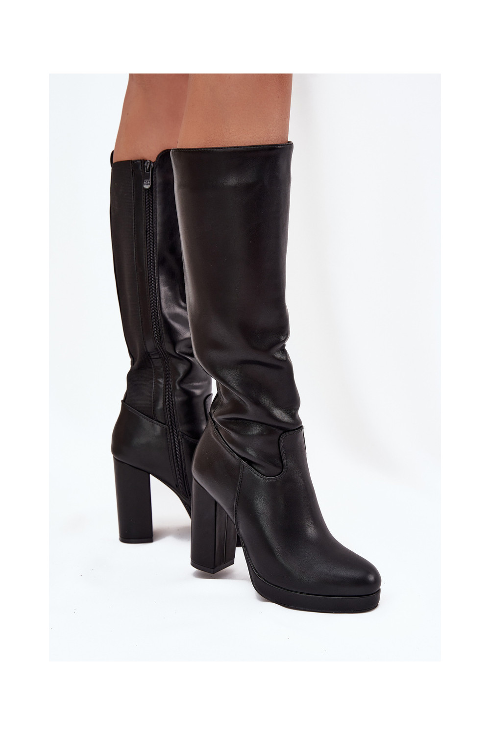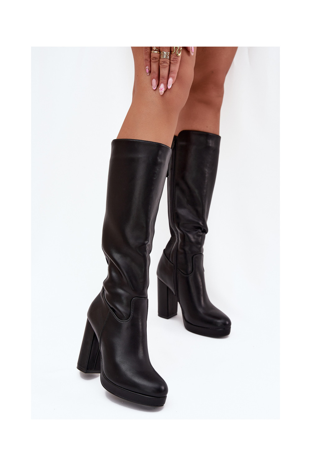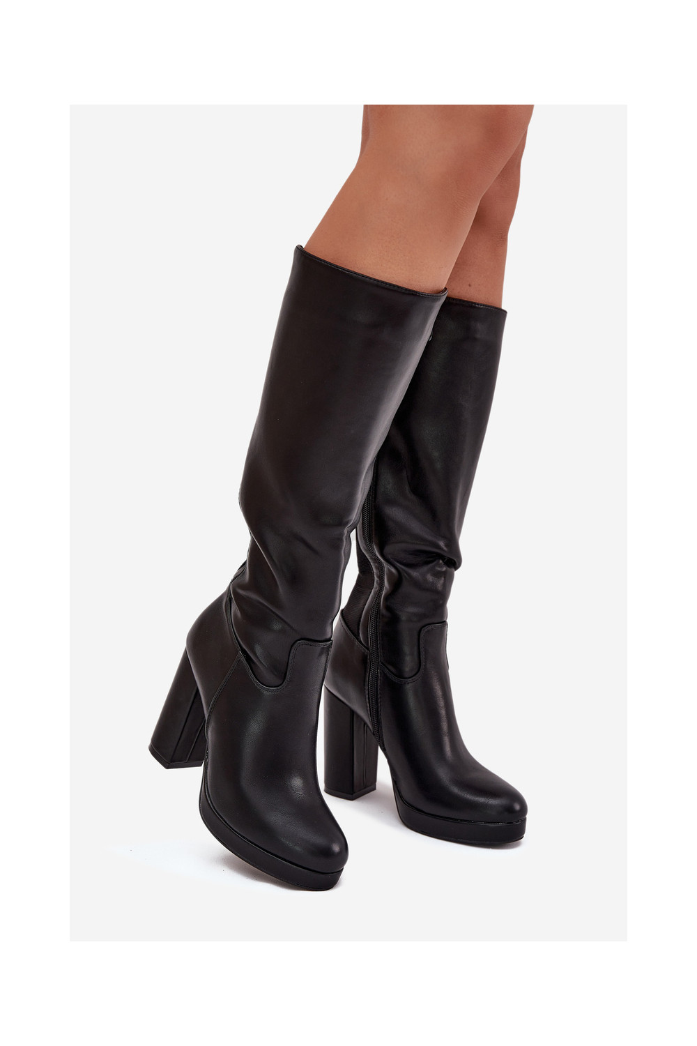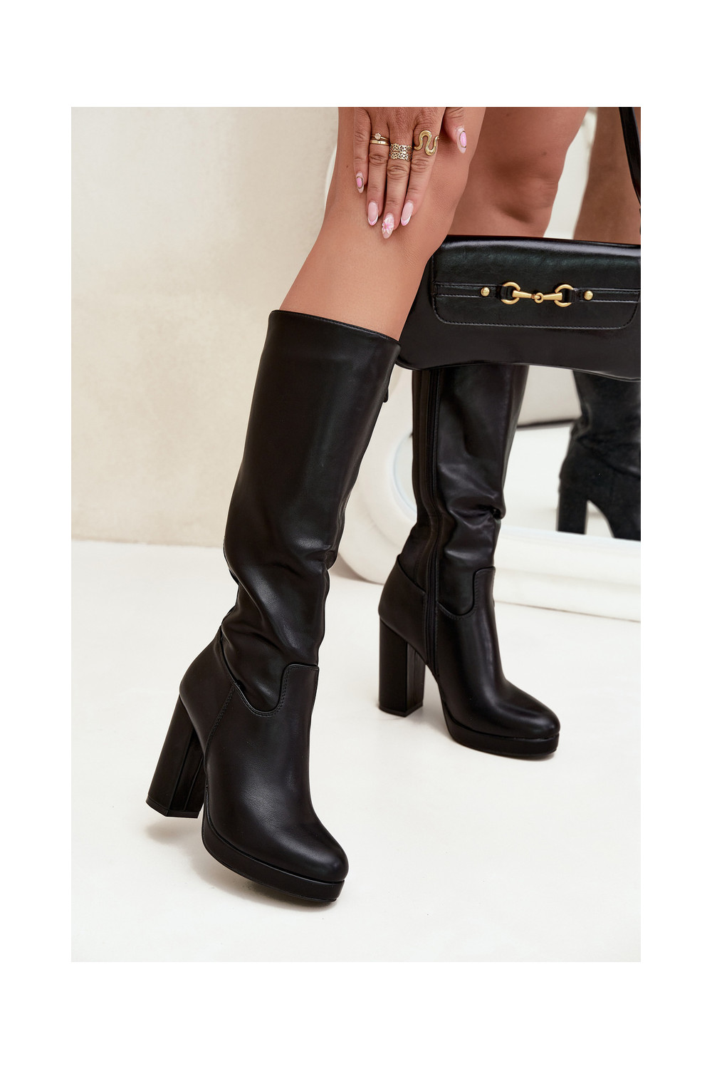 Moteriški ilgaauliai batai iki kelių su kulniukais, dirbtinės odos, juodos spalvos Thalina