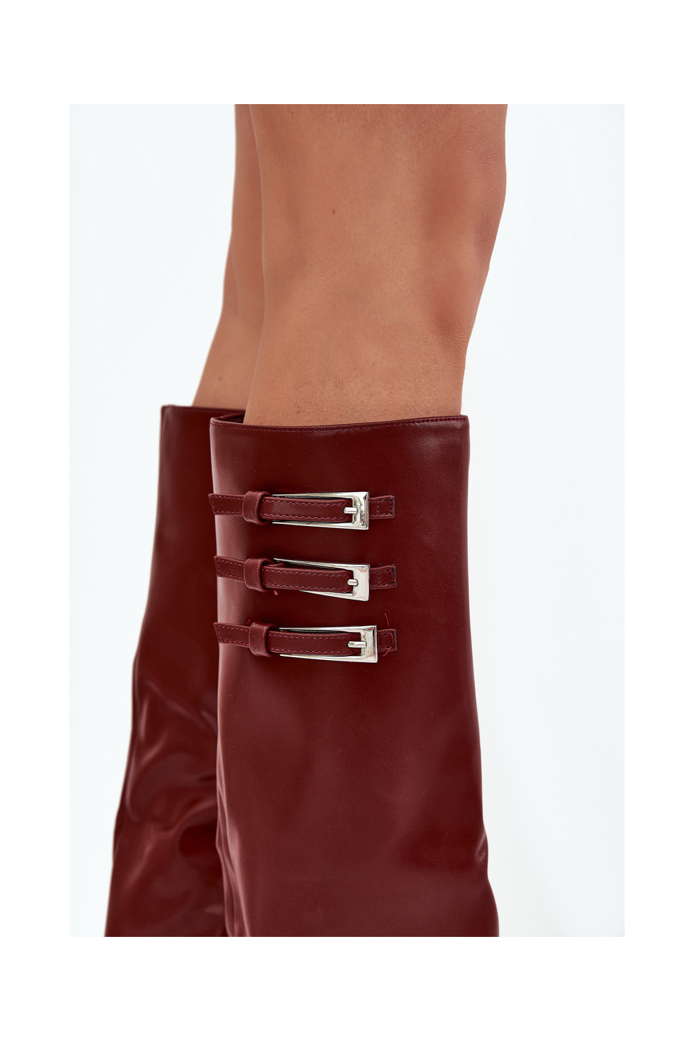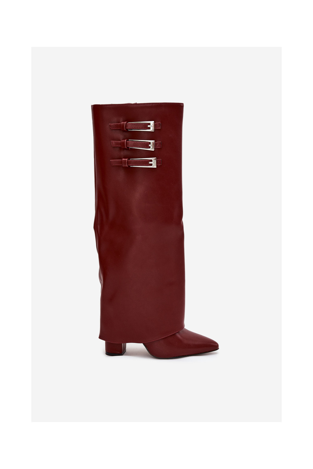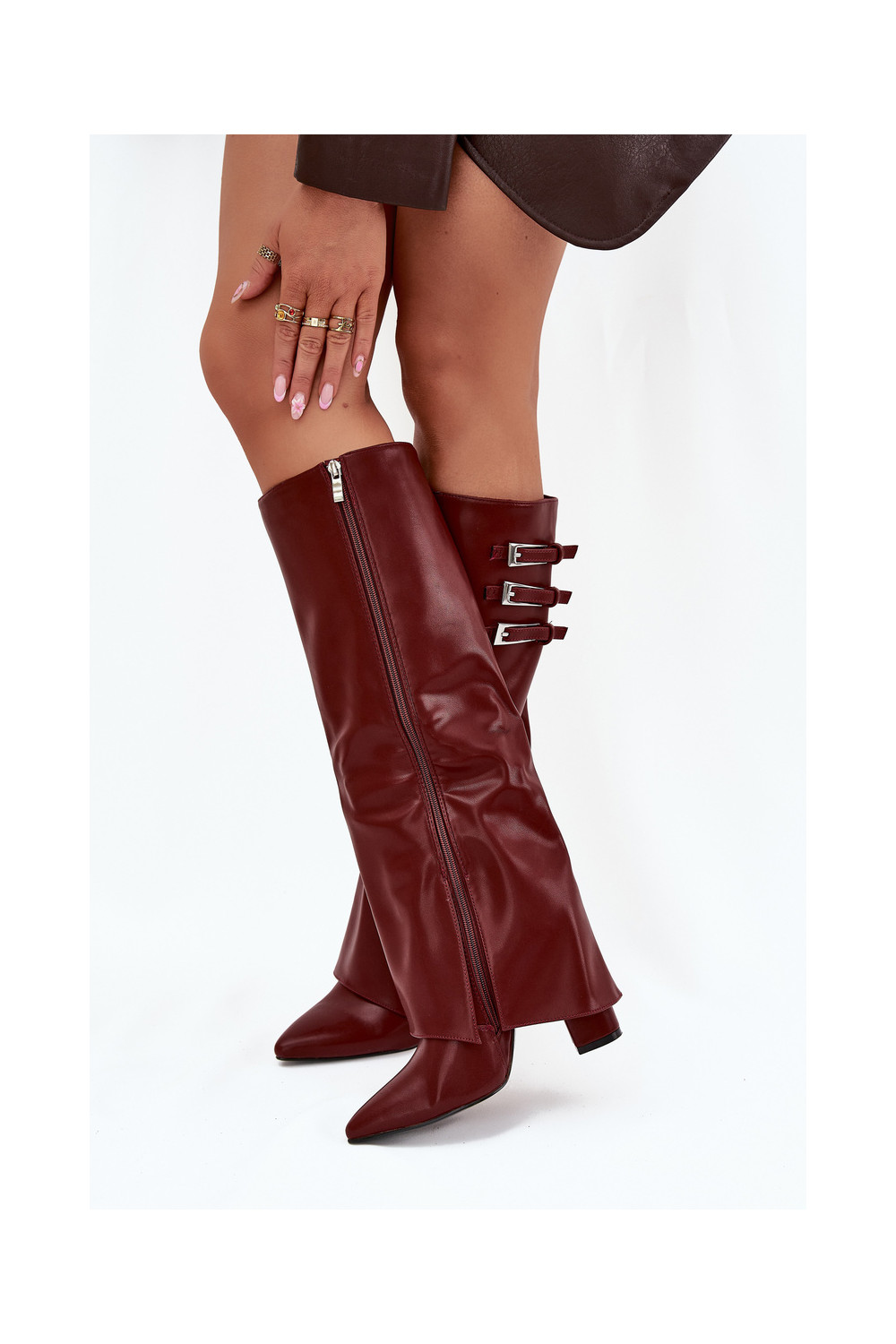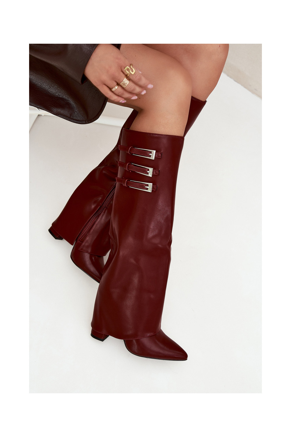 Moteriški ilgaauliai batai su kulniukais, dekoruotu aulu, juostelėmis ir sagtimis, šokolado spalvos Nirisa