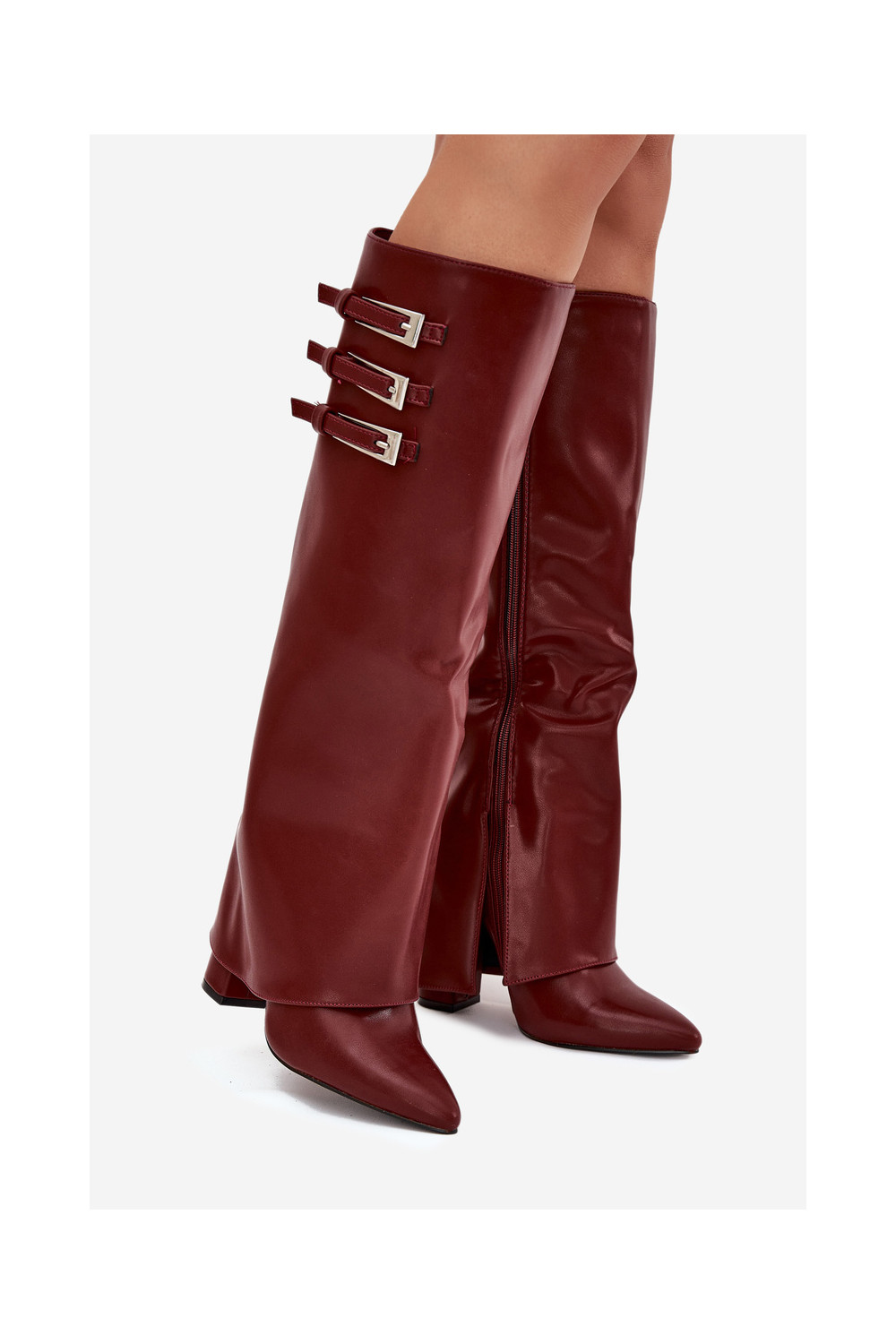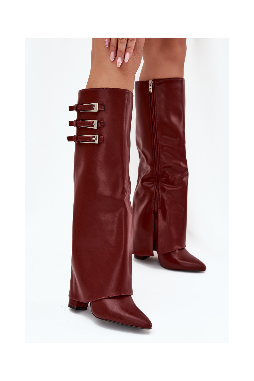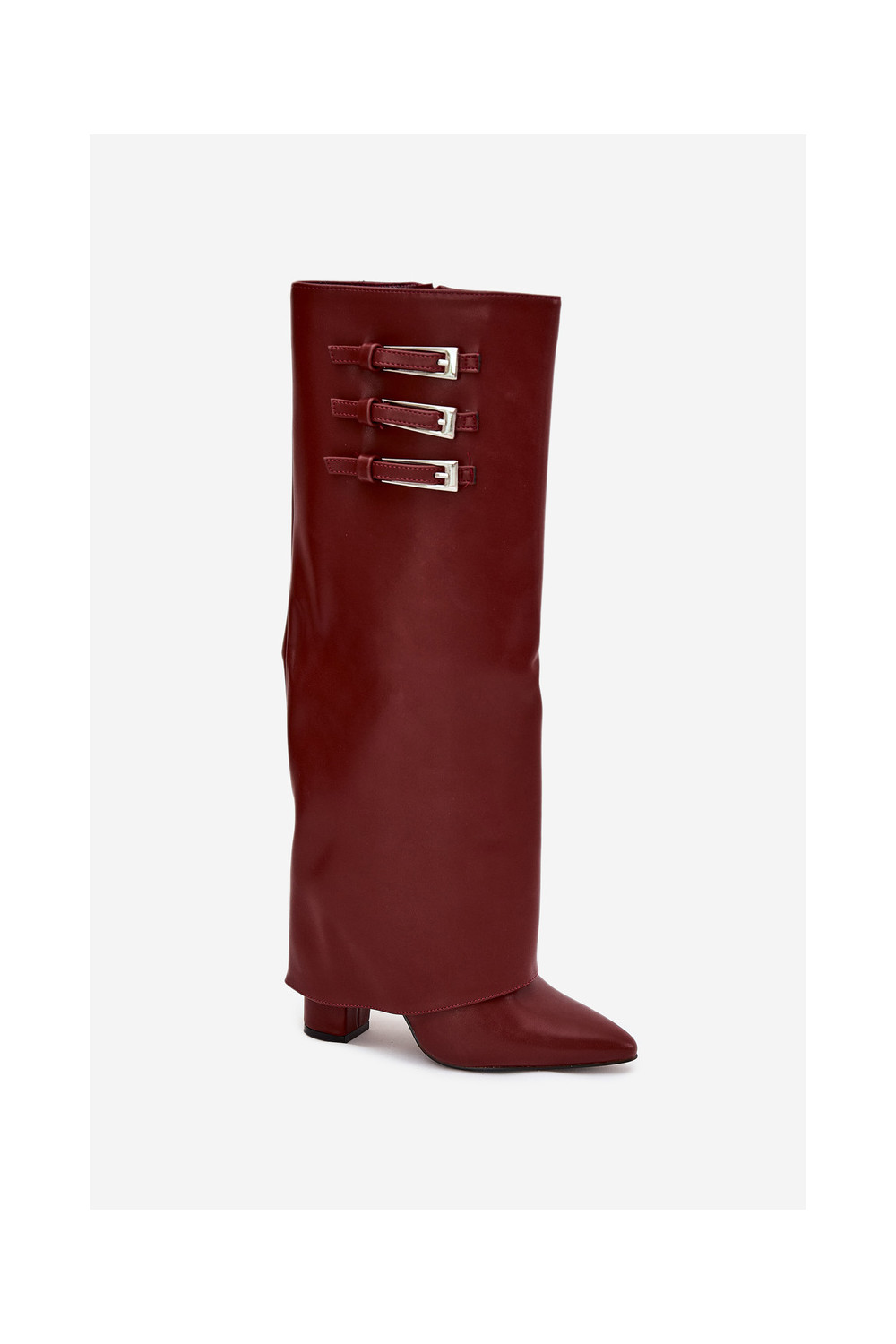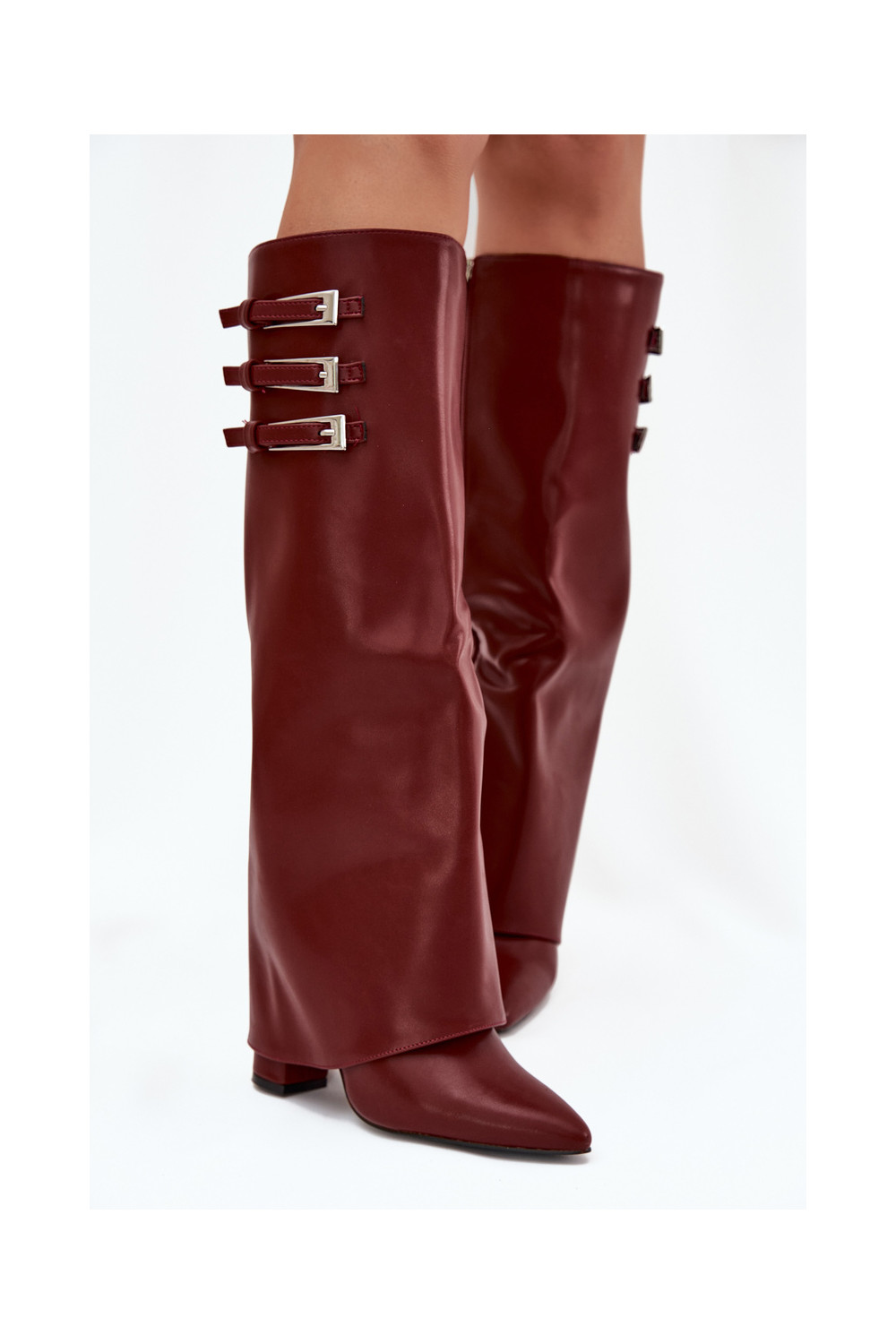 Moteriški ilgaauliai batai su kulniukais, dekoruotu aulu, juostelėmis ir sagtimis, šokolado spalvos Nirisa