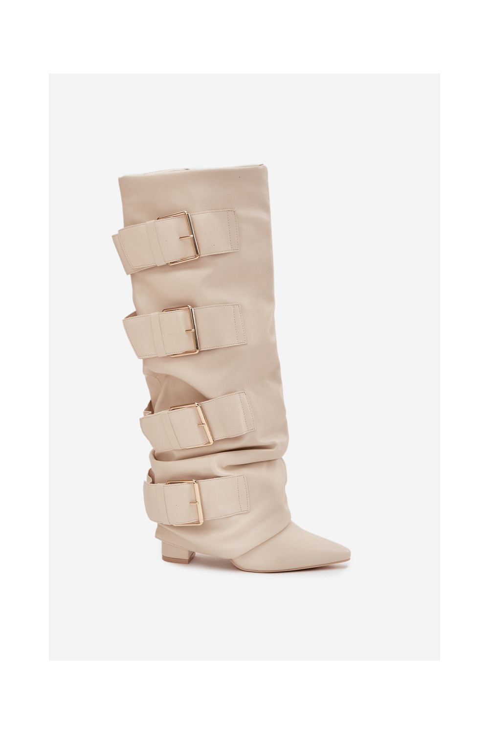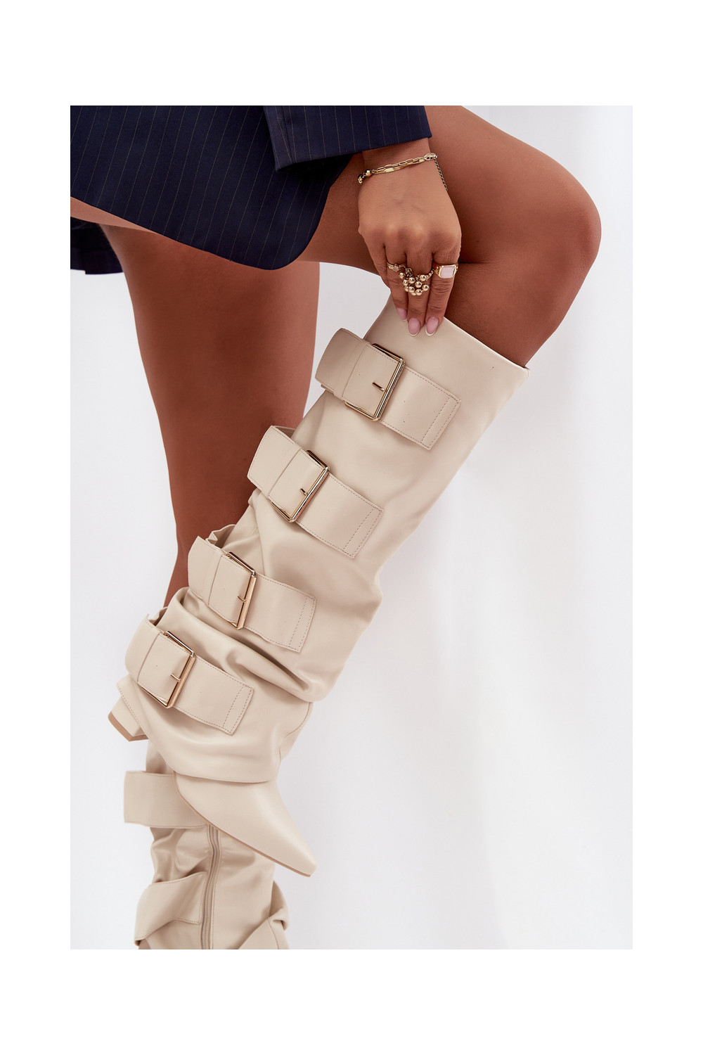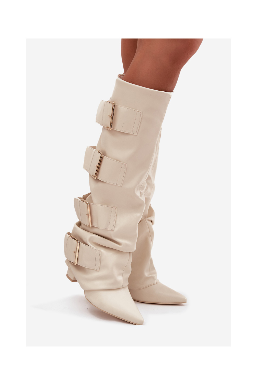 Moteriški ilgaauliai batai su kulniukais, įsiūta aule ir aukso spalvos sagtimis dramblio kaulo spalvos Isavelle