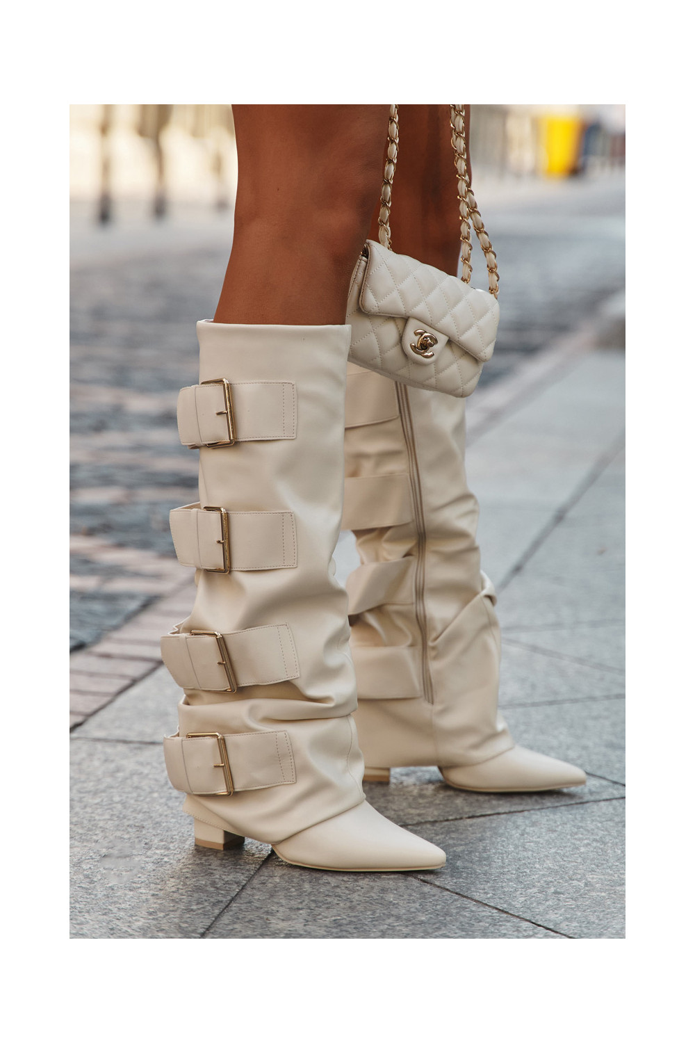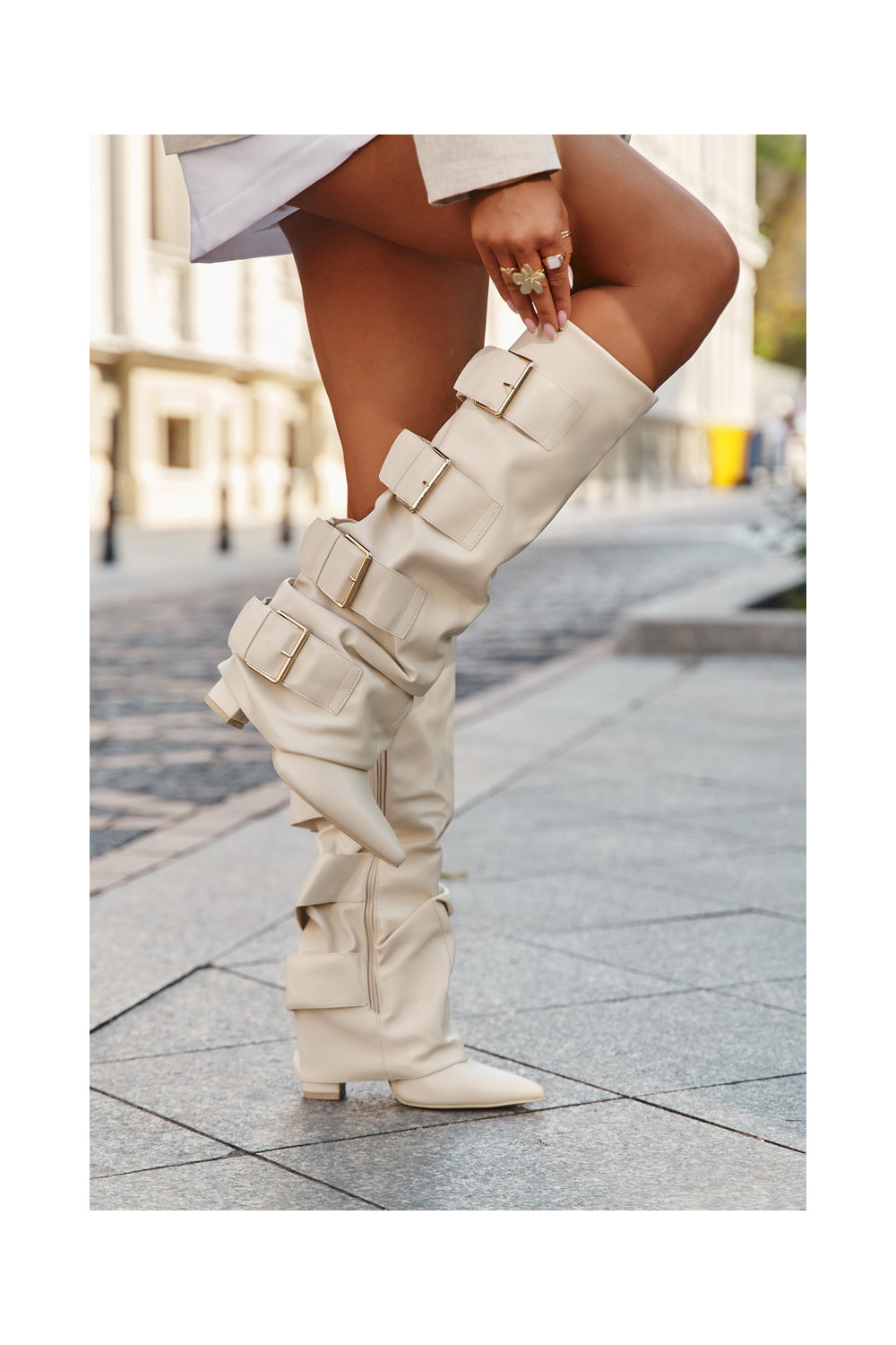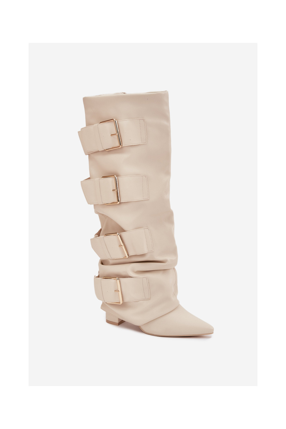 Moteriški ilgaauliai batai su kulniukais, įsiūta aule ir aukso spalvos sagtimis dramblio kaulo spalvos Isavelle