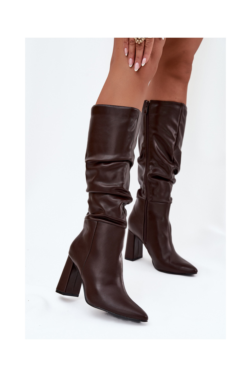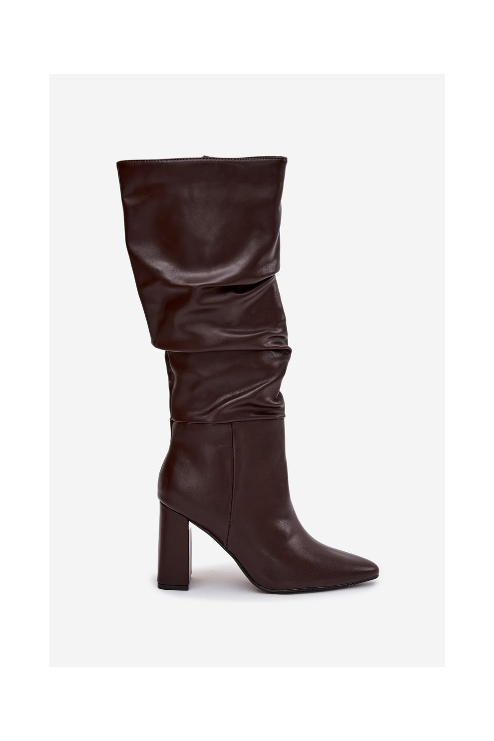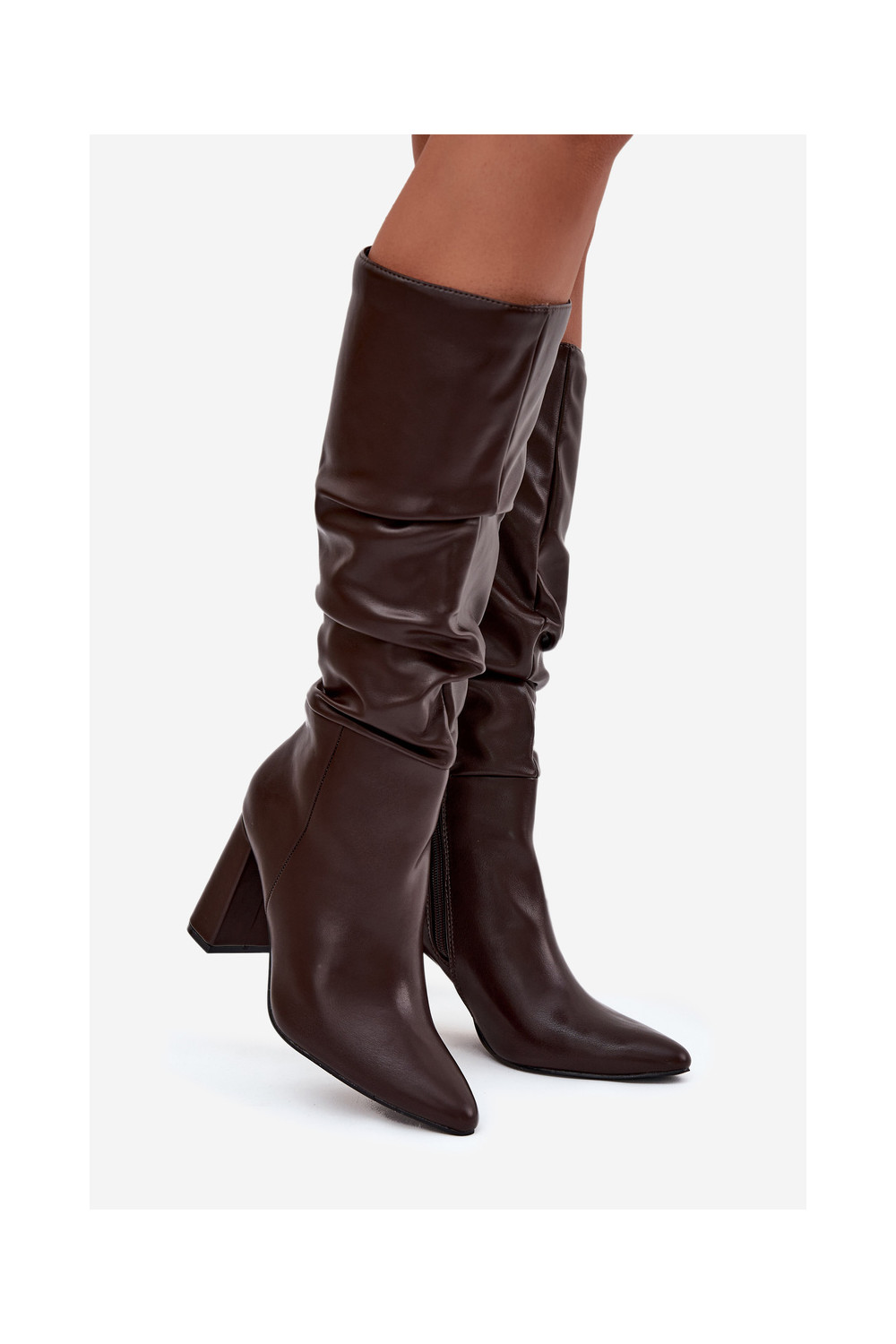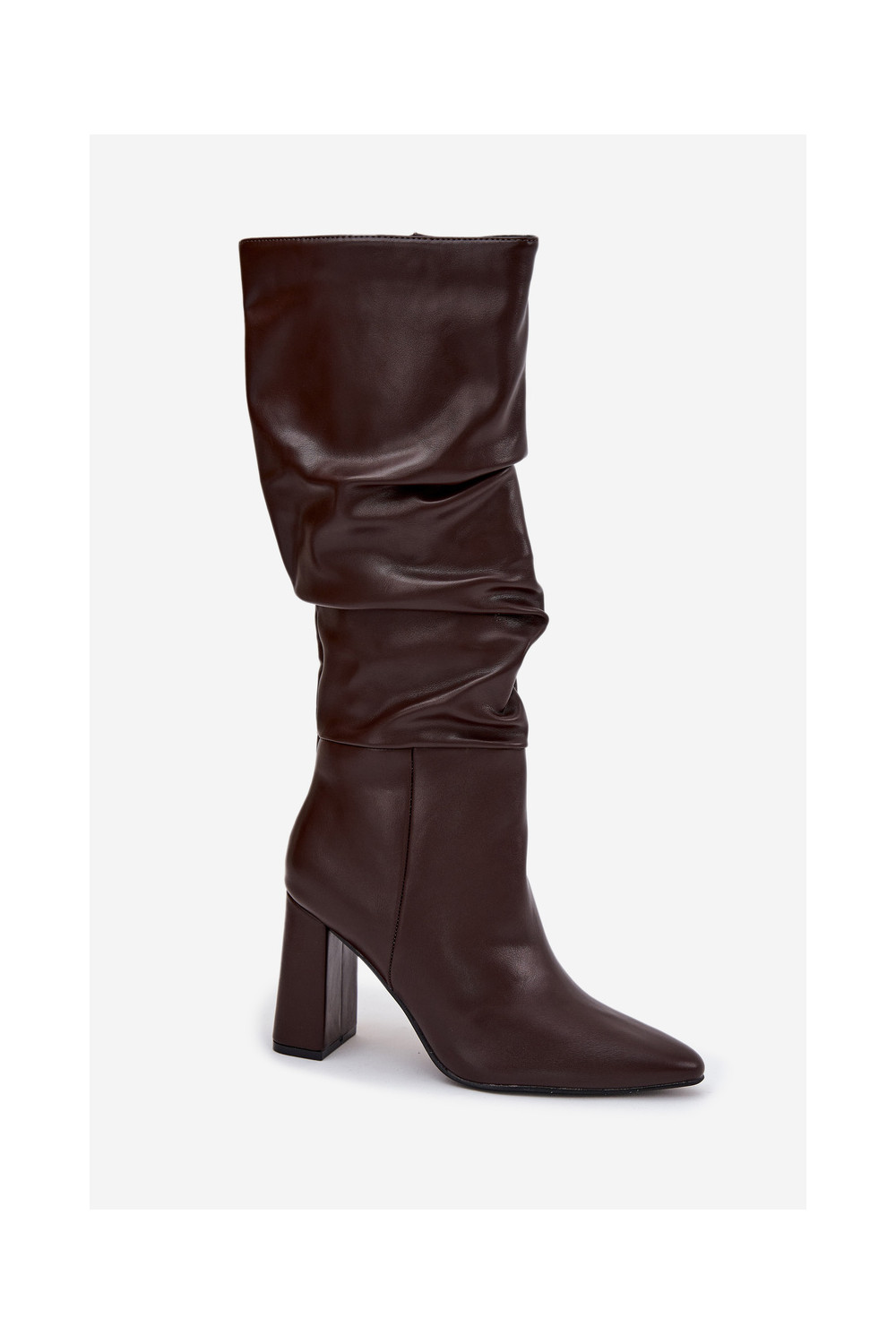 Pašiltinti moteriški ilgaauliai batai su kulniukais ir raukiniais šokolado spalvos "Dariane"
